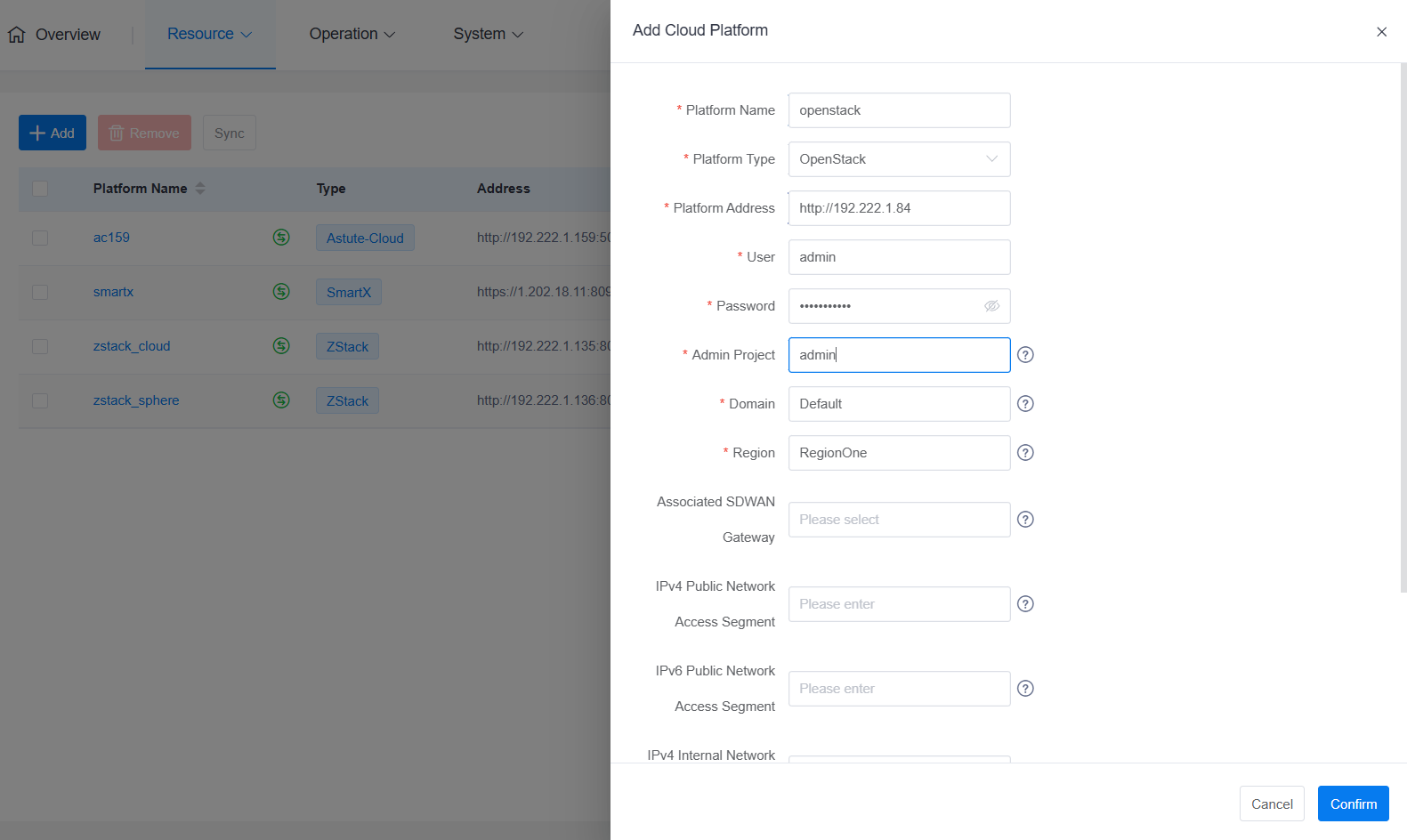 Configure Attributes: In the editing interface, select the cloud platform type as OpenStack. After entering the information according to the parameter details below, click "OK".