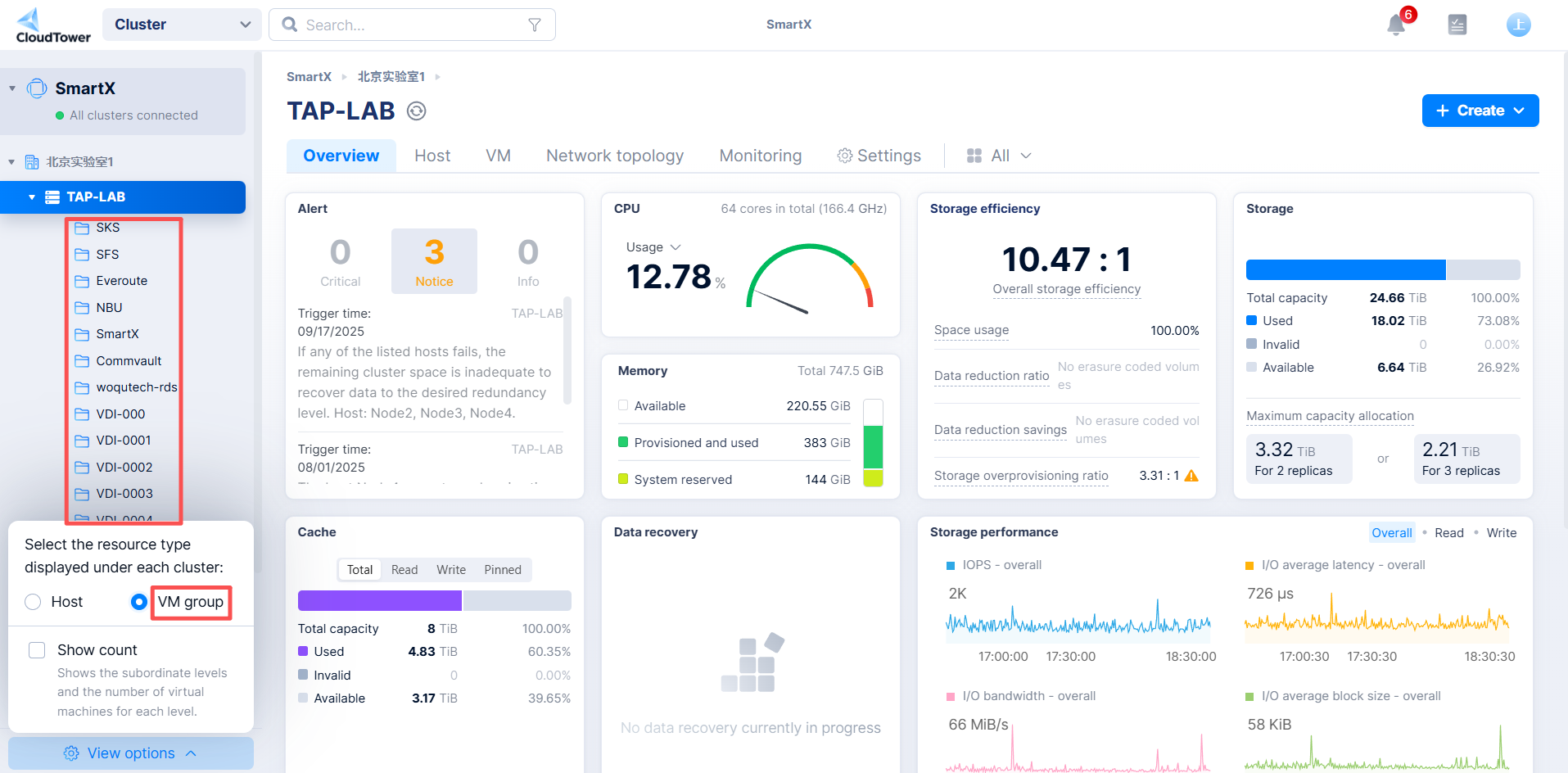 In the lower left corner of SmartX, switch "Show under cluster hierarchy" to "VM Group" to view the list of prepared VM groups in the directory tree.