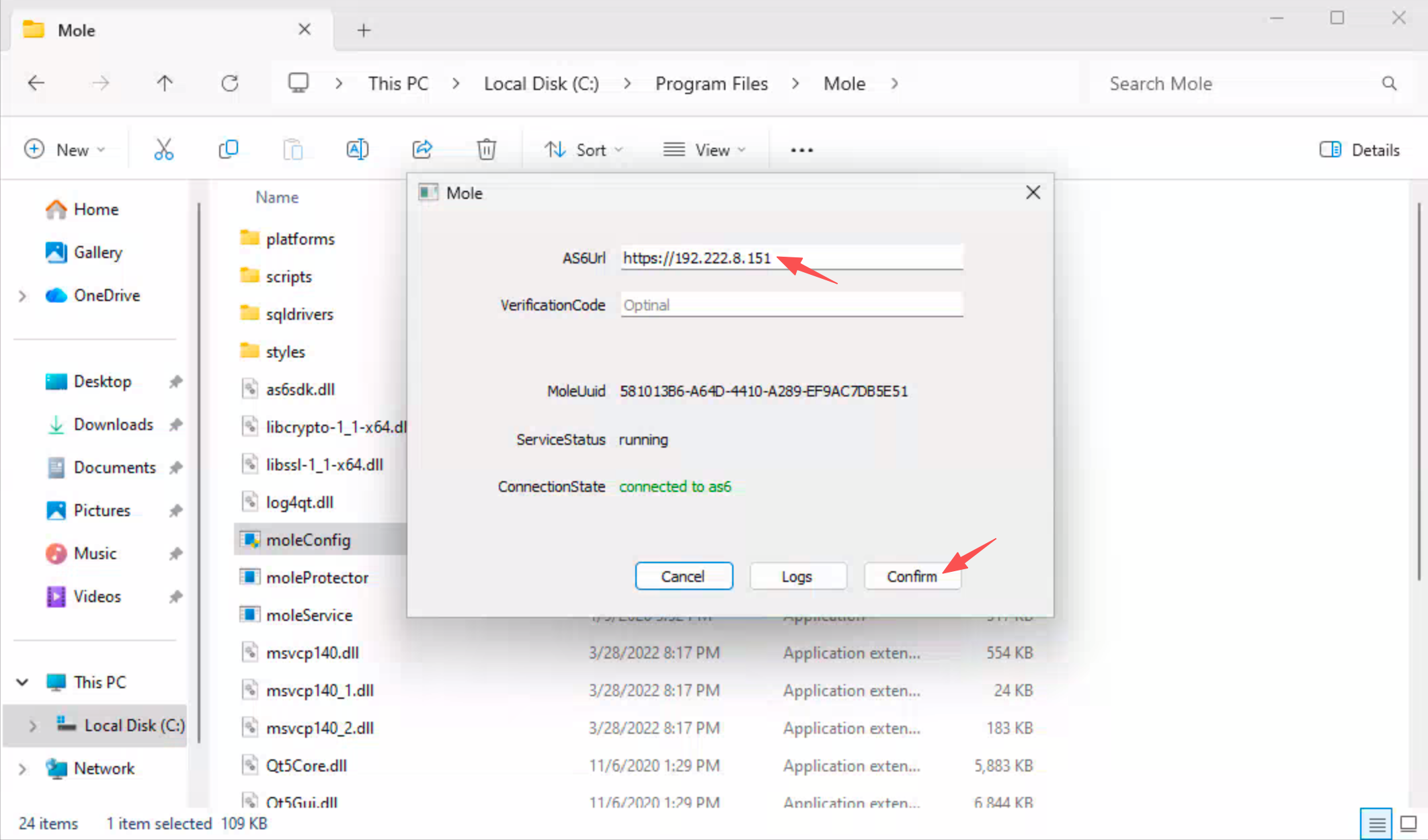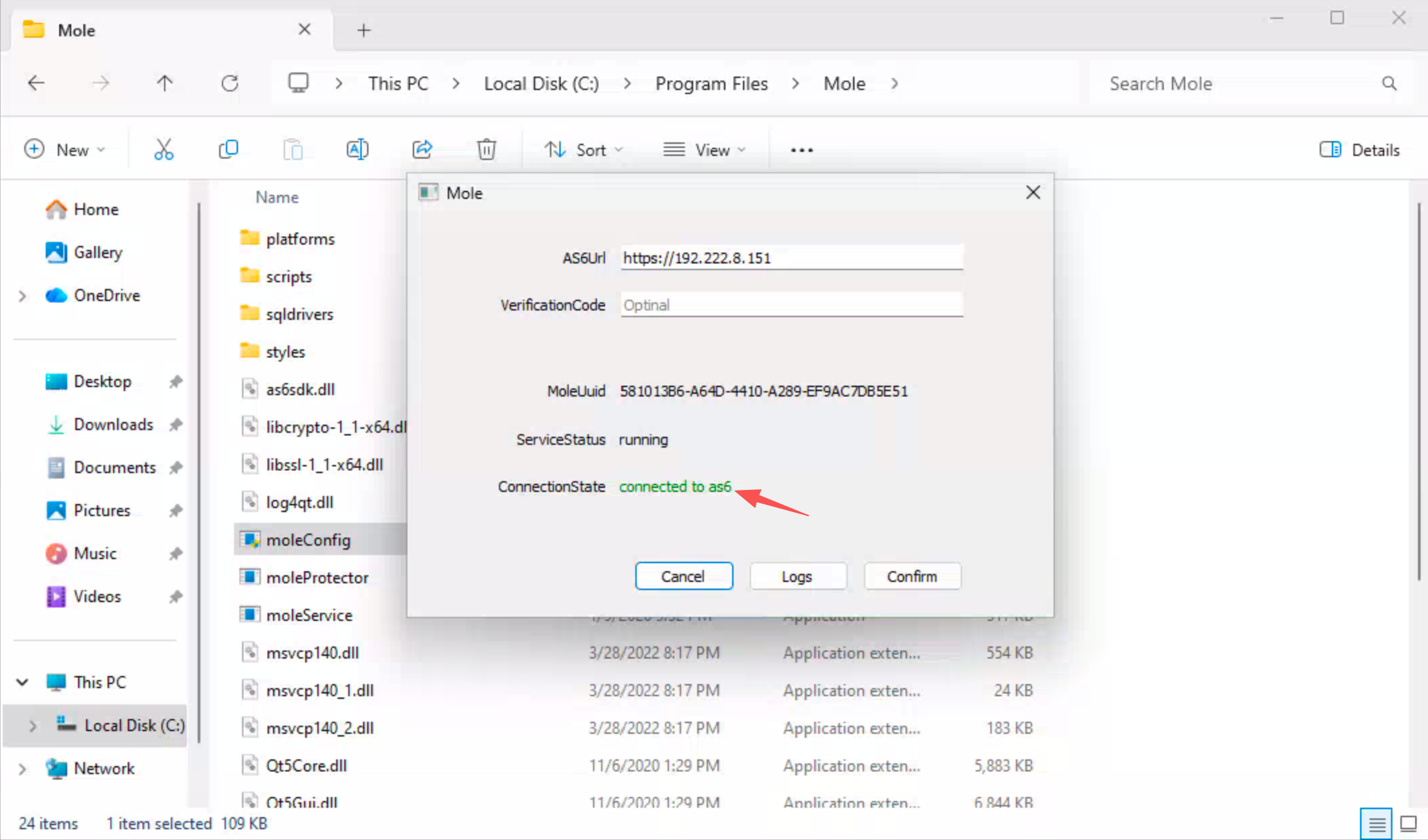 C:\Program Files\Mole\moleConfig.exe - Operation Instructions: In the Mole configuration interface, fill in the IP address of the master management node in the AS6 Address field and click Apply Configuration.