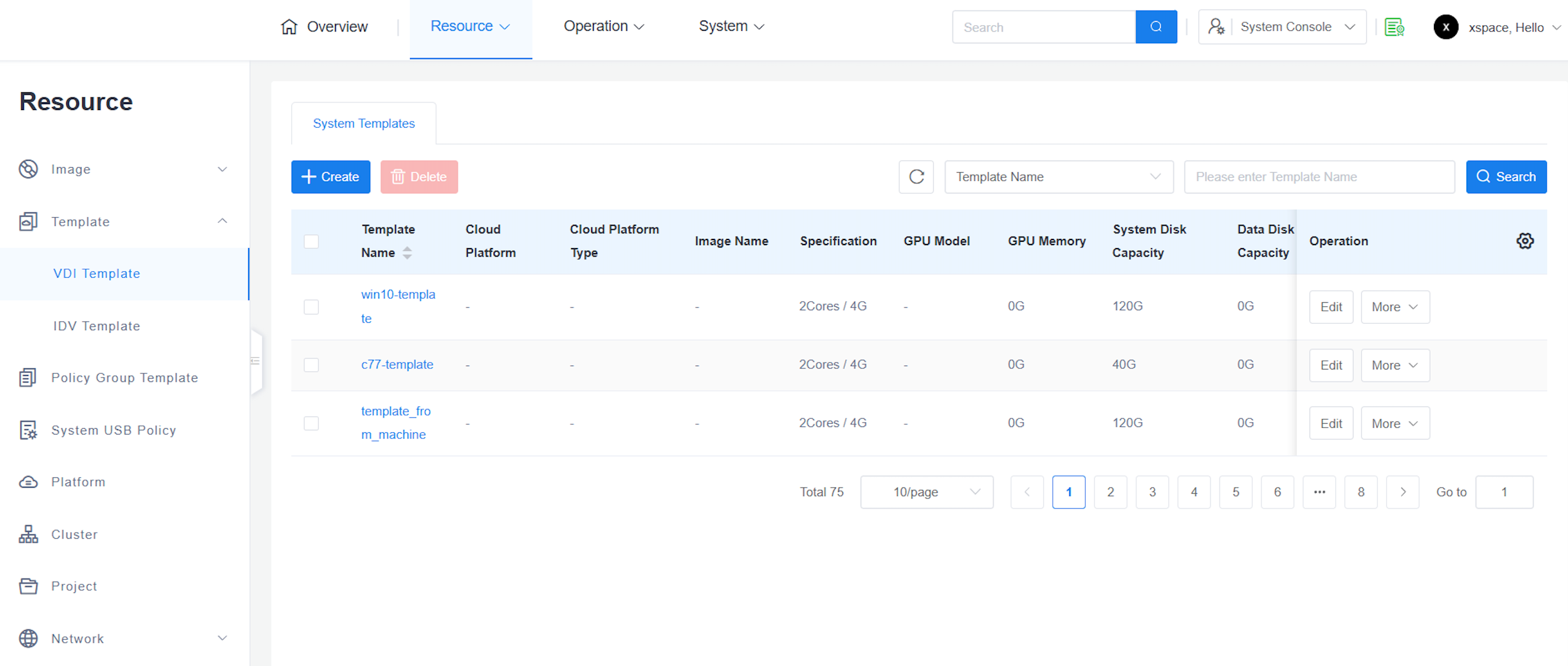 By clicking "Resources -> Templates -> VDI Templates" in the system console or tenant console, you can view and manage cloud desktop templates.