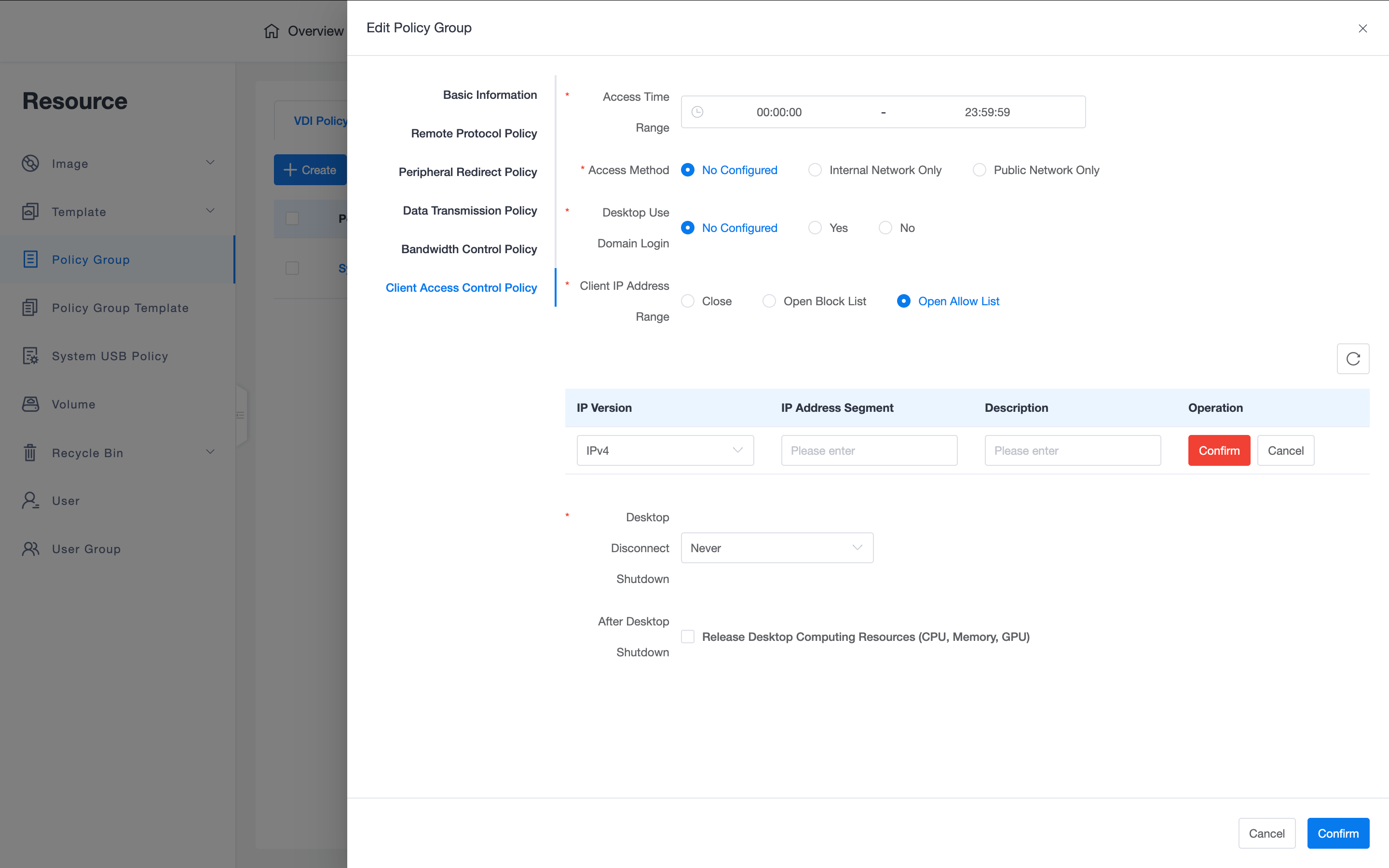 - Supports setting whether the desktop must use a domain account for login, and policies for powering off or releasing resources (CPU, memory, graphics card) after desktop disconnection.