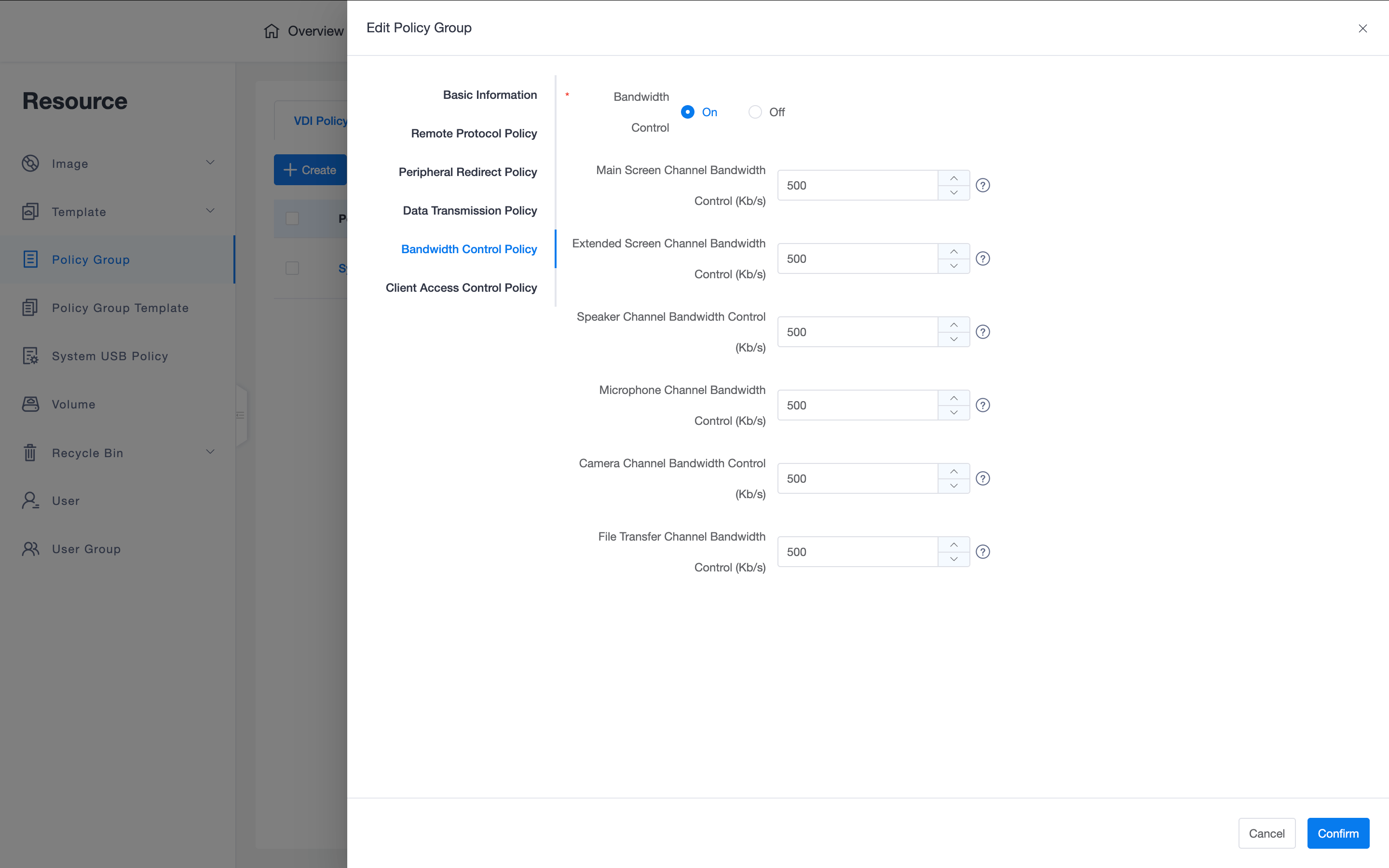 - Supports setting maximum bandwidth limits (Kb/s) separately for main screen, extended screen, speakers, microphones, cameras, and file transfer channels.