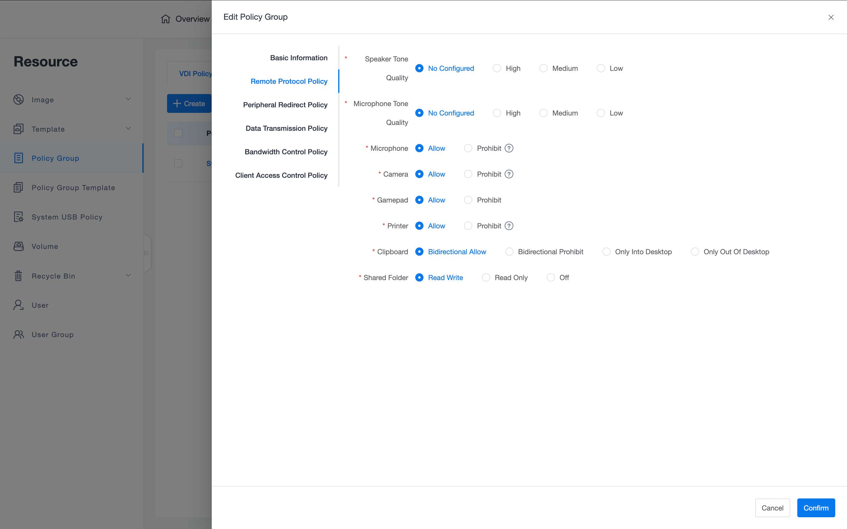 - Configuration Items: Supports configuring speaker/microphone audio quality (high, medium, low) and allowing or prohibiting cameras, game controllers, and printers.