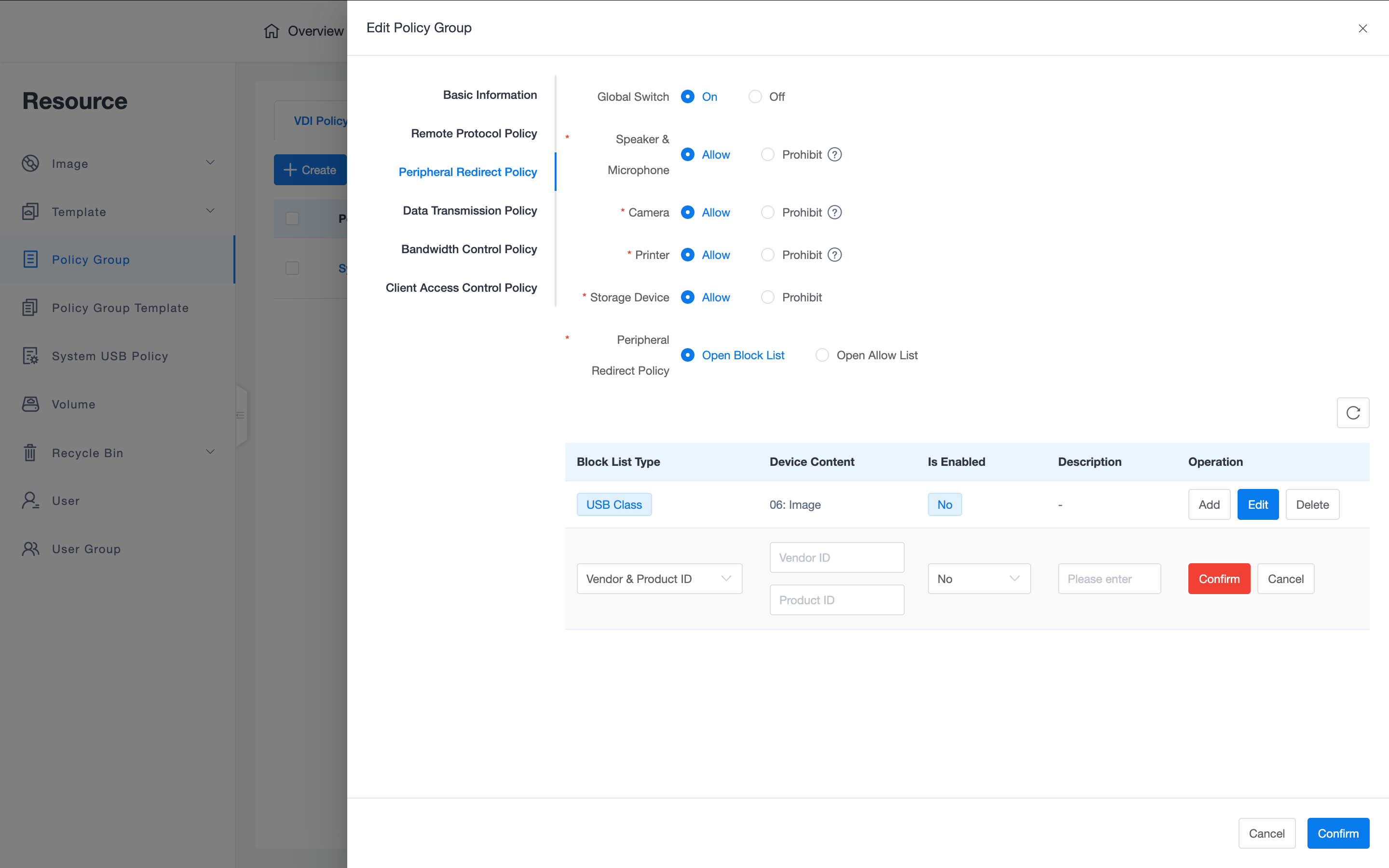 Tip: It is recommended to divide and define policy groups based on company department functions. For example, for R&D departments with extremely high security requirements, it is recommended to enable whitelist mode in "Peripheral Redirection Policies", allowing only necessary office peripherals to connect.
