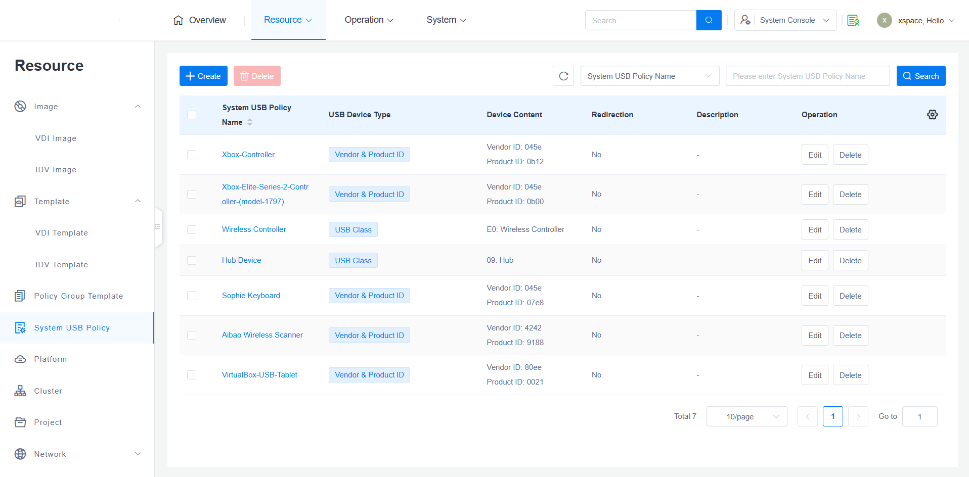 The system policies displayed in "Resources -> System Policies" are the preset external device control lists in the xSpace system. Due to technical or security reasons, some local peripherals connected to cloud desktop clients need to be prohibited from being passed through to the internal cloud desktop.