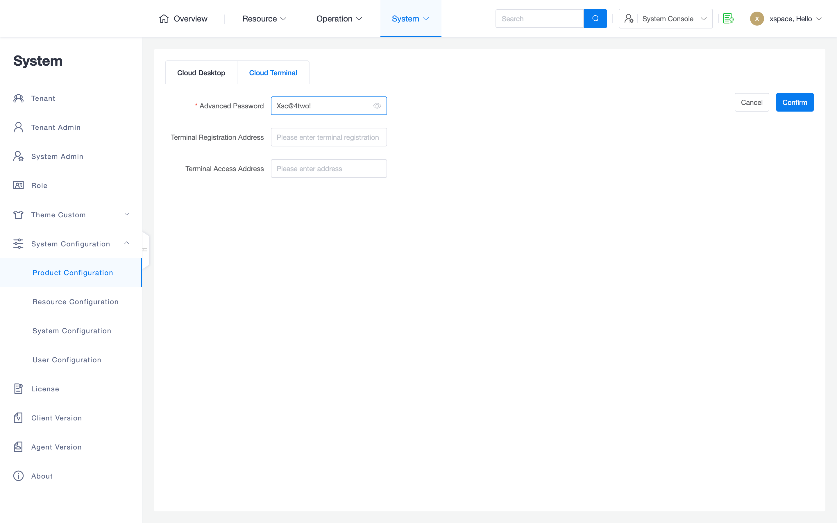 System administrators can access the "System -> System Parameters -> Product Configuration" page in the system console to configure global product-related parameters. The most typical configuration item is the "Cloud Terminal Advanced Settings Password".