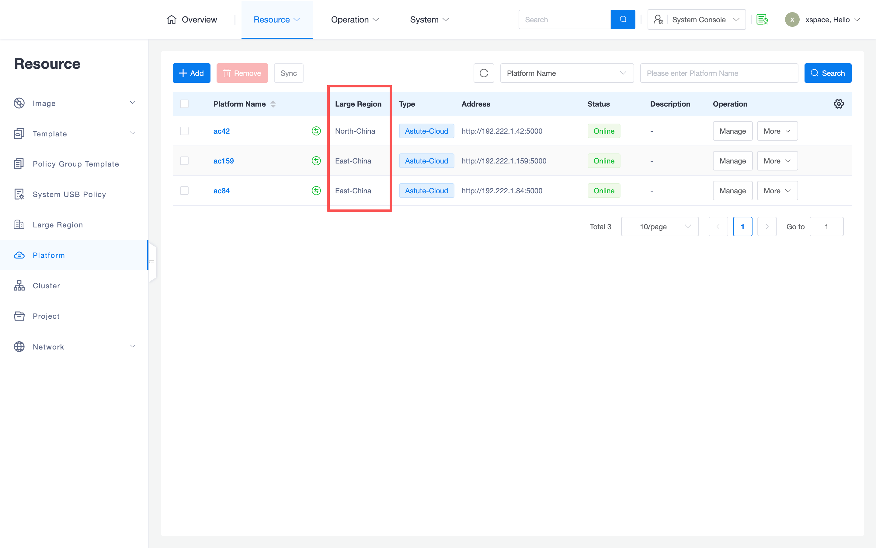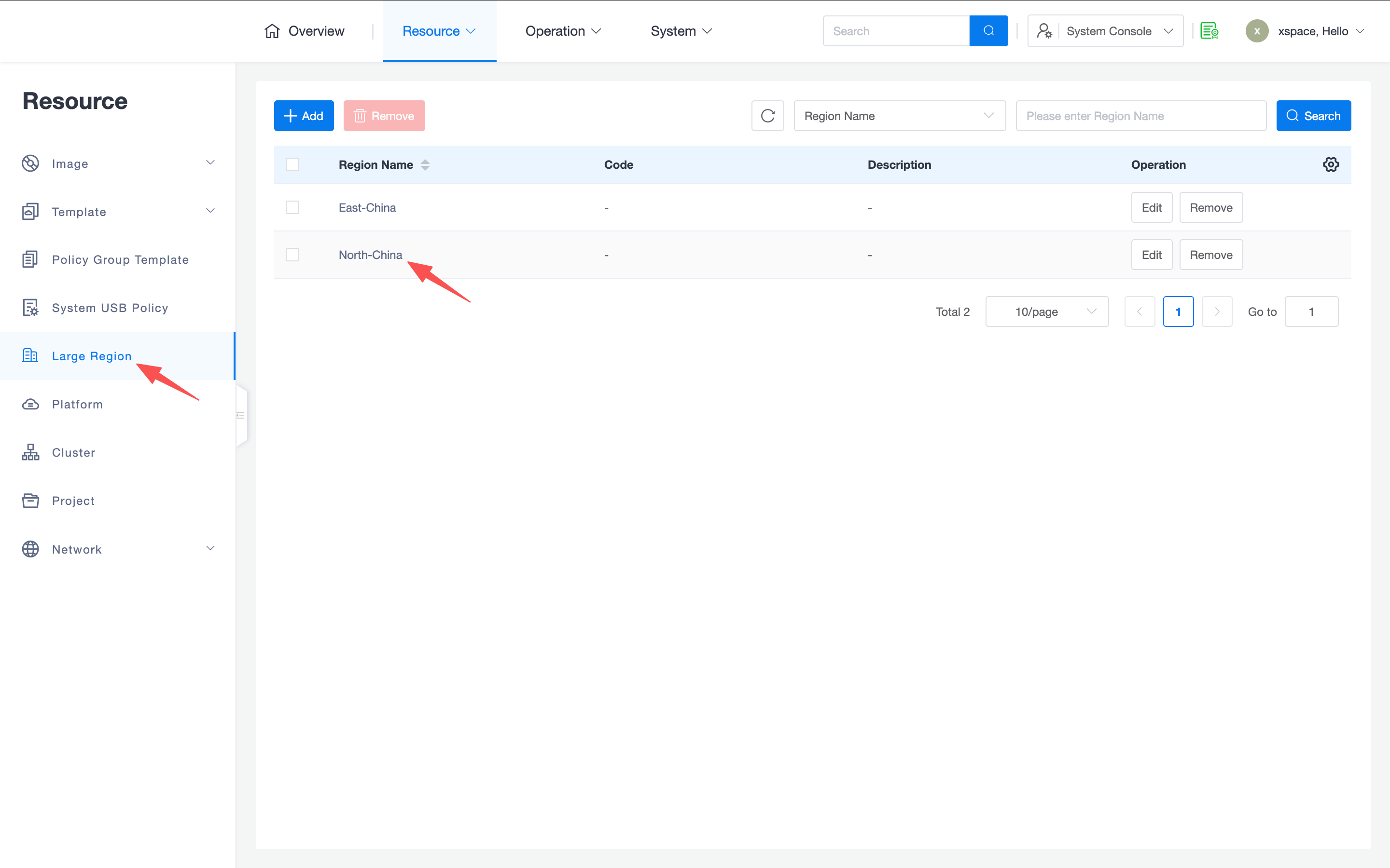 - Resource Partitioning: After configuring 1-3 layers of regions, corresponding cascading menu items will appear in the "Resources -> Regions" menu of the system console. Administrators need to add specific region definitions here and assign cloud platforms to corresponding regions.