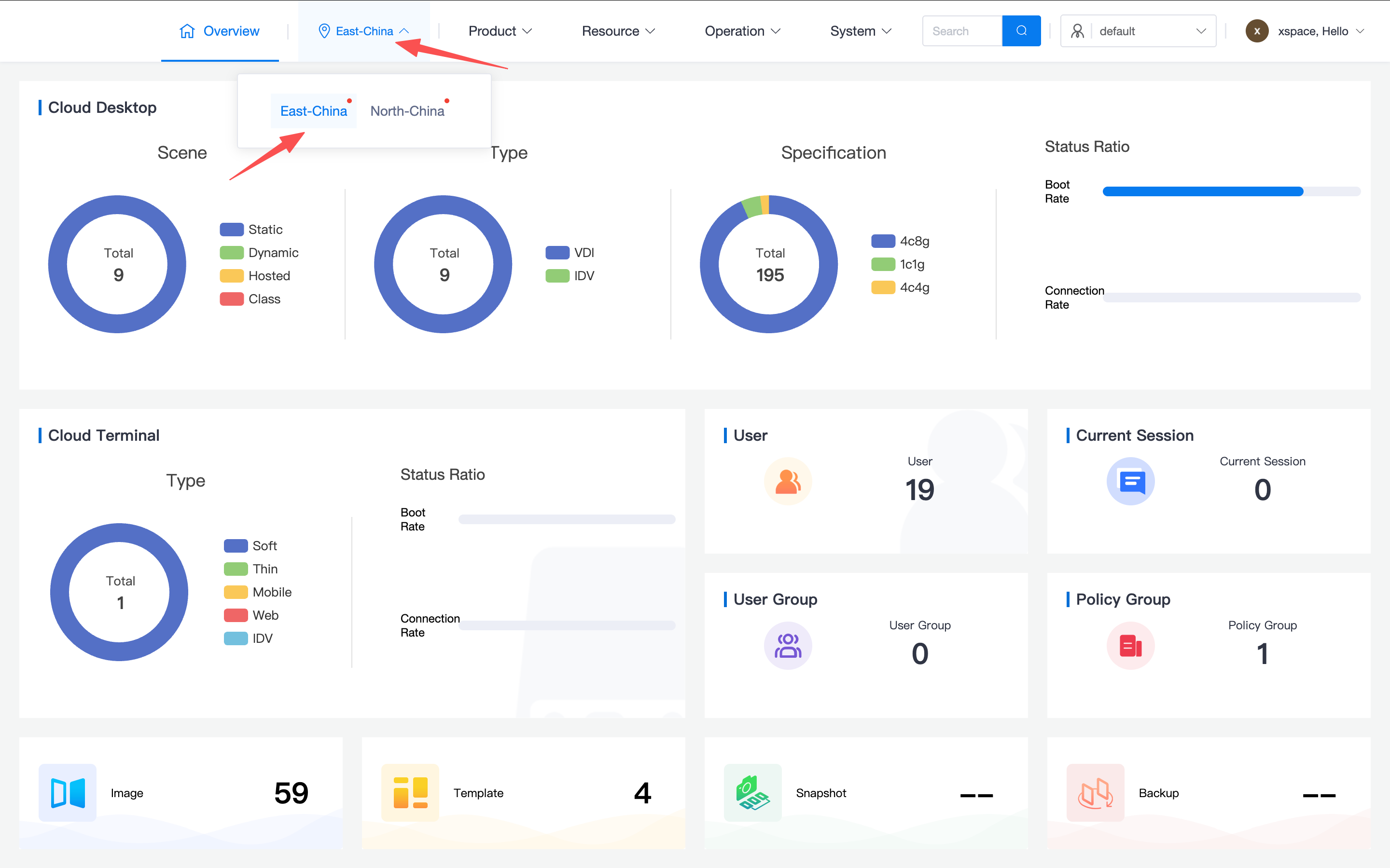 - Tenant Console Management Logic: After enabling the region function, tenant administrators, when managing desktop resources, need to first switch to the corresponding region in the interface before operating on resources within that region.