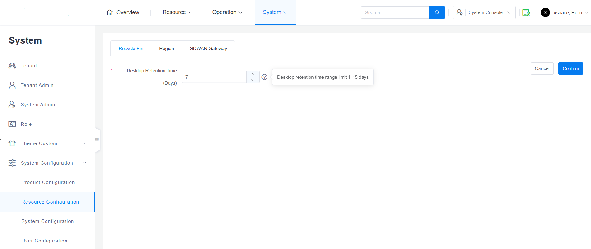 System administrators can access the "System -> System Parameters -> Resource Configuration" page in the system console to configure resource-related parameters. This mainly includes recycle bin retention duration, multi-site region hierarchy, and global definition of SDWAN access gateways.