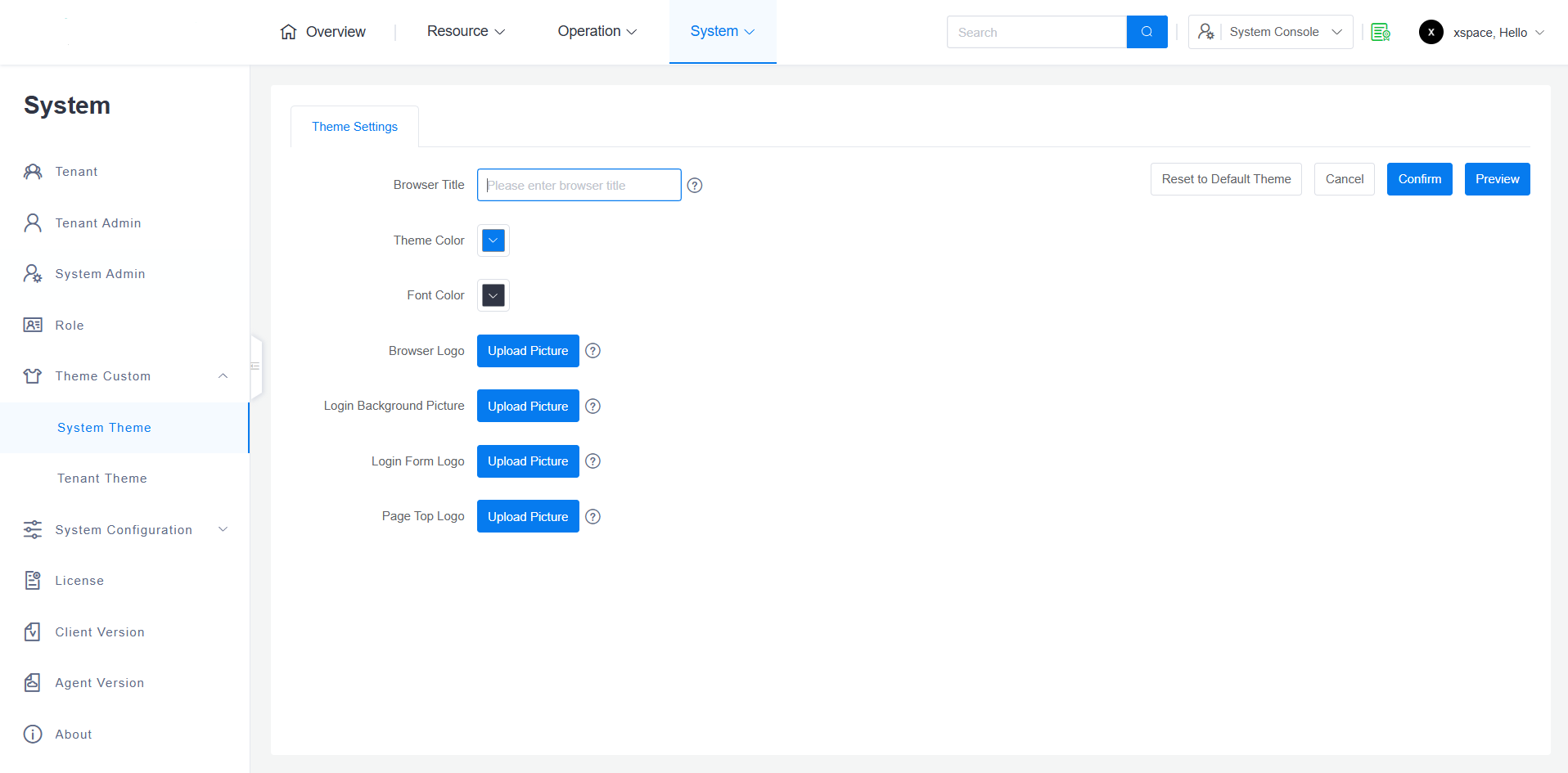 - Tenant Personalization: If a tenant administrator customizes the theme in their tenant console, the tenant's settings will take precedence. If the tenant makes no modifications, they will automatically inherit the default scheme set by the system administrator.