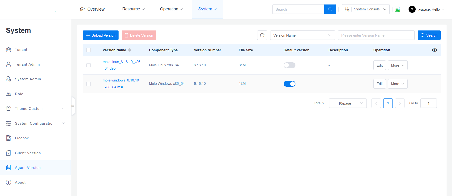 System administrators can access "System -> Agent Versions" in the system console to view the list of currently uploaded agent installation package versions.