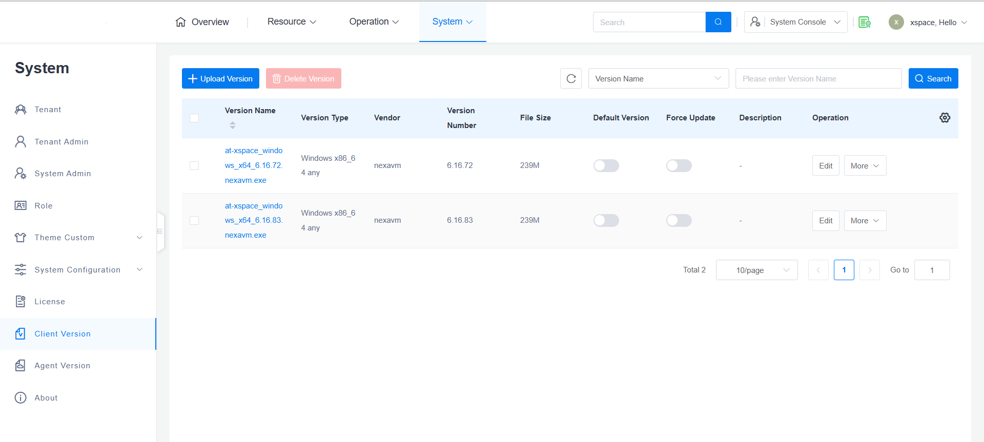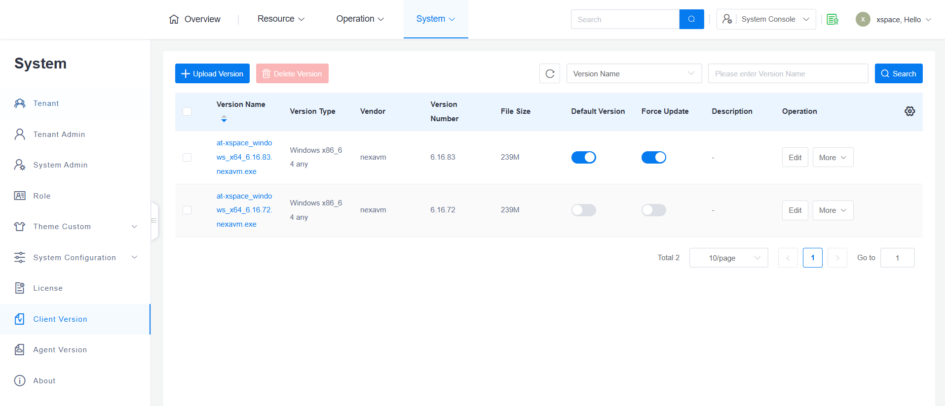 System administrators can access "System -> Cloud Terminal Versions" in the system console to view the list of currently uploaded client installation package versions.