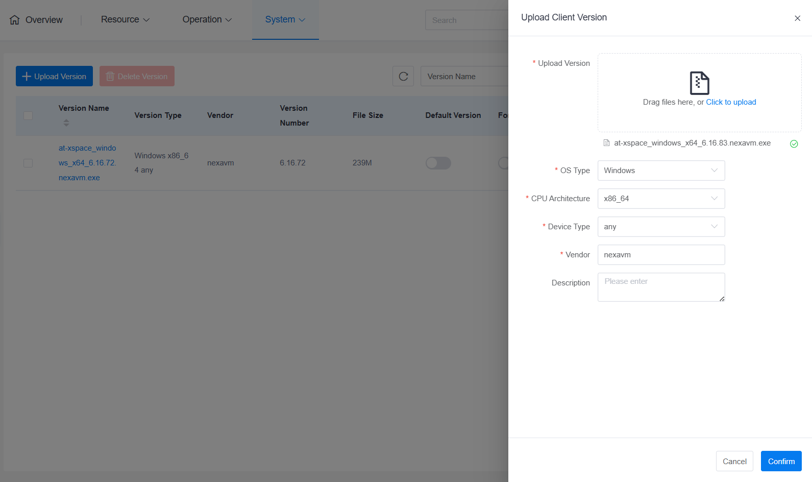 - Confirmation Process: Please wait until the version file is 100% uploaded and a green checkmark appears. At this point, the frontend will automatically fill in the relevant parameters. The administrator only needs to intervene manually if the content is incorrect, and finally click Confirm.