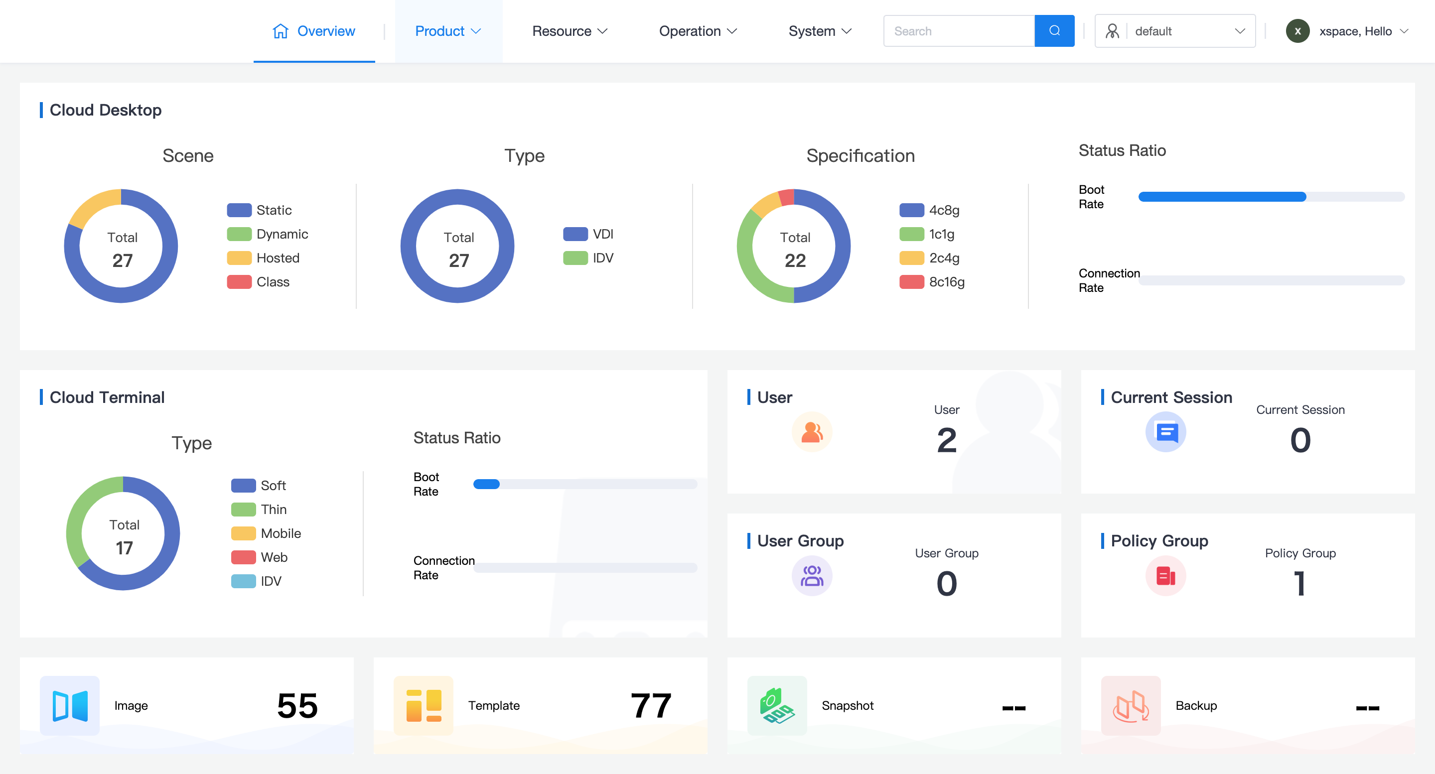 Upon entering the tenant console, administrators can view real-time statistics of various products, resources, and operational statuses within that tenant on the overview page.