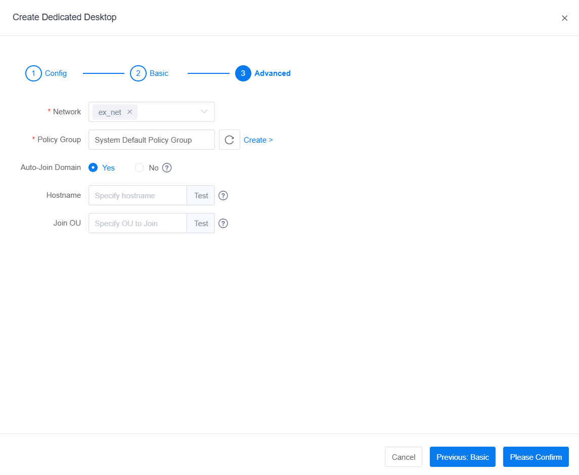 WIN-xxxxxorDESKTOP-xxxxxformat (length not exceeding 15 characters). - Create Template: Does not support specifying hostname.