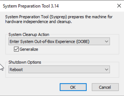Select "Enter System Out-of-Box Experience (OOBE)", check "Generalize", and select "Restart":