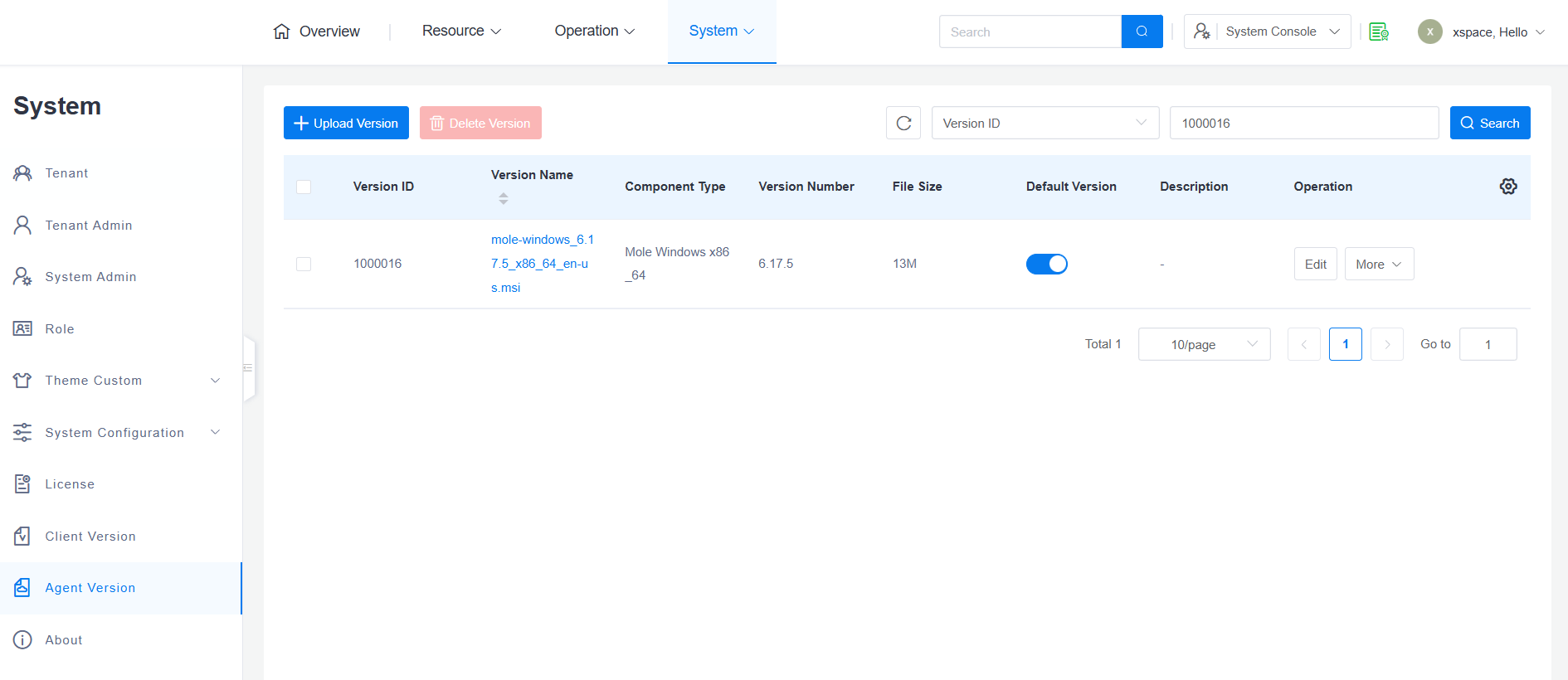 Upload Mole Agent: Log in to the system console, go to the "System -> Agent Versions" page, upload Mole version >=6.17.4, and set it as the default version.