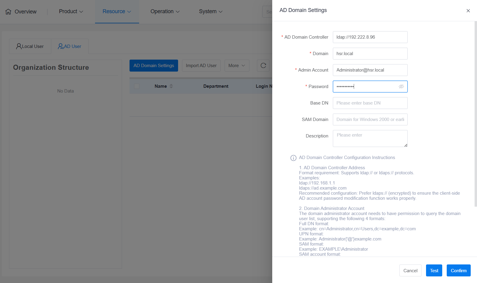 Configure AD Domain: Log in to the tenant console, go to the "Resources"-> "Users" page, ensure the AD domain is correctly configured, detected, and saved.