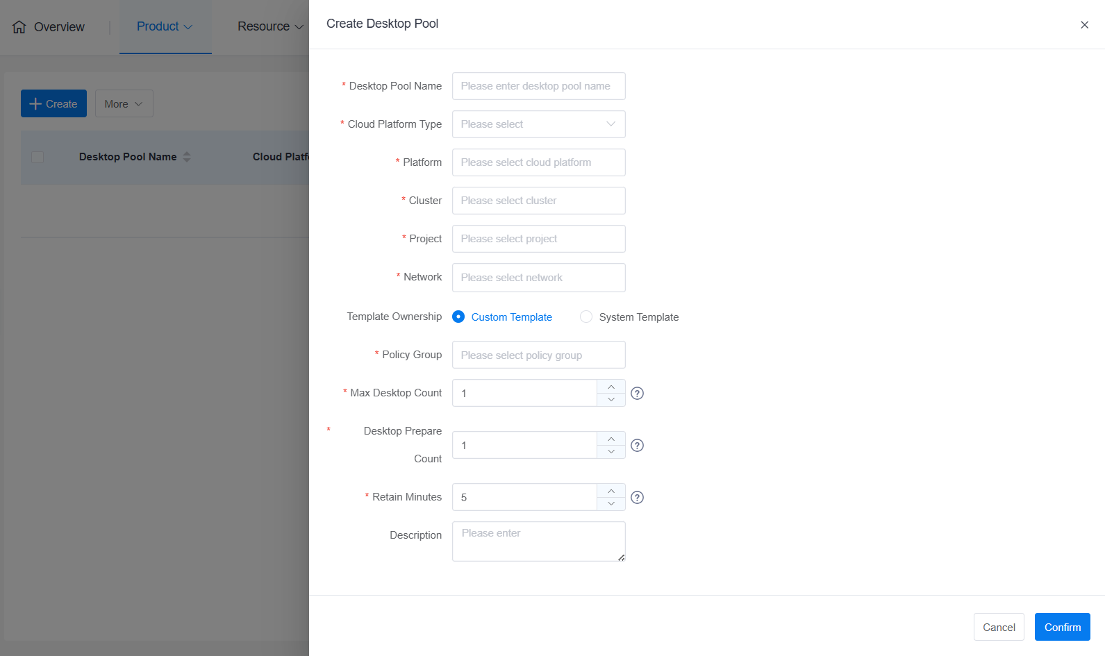 - Base Resource Association: Requires selecting a cloud platform type, a specific cloud platform instance, and a target cluster. Subsequent created desktop VM instances will run within the selected cluster.