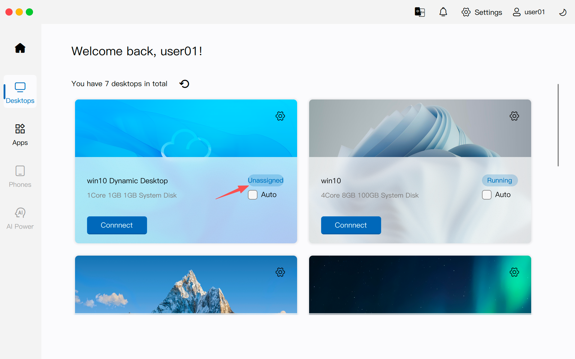 - Status Display: After logging in to the client, users will see a dynamic desktop card with "Unassigned" status.