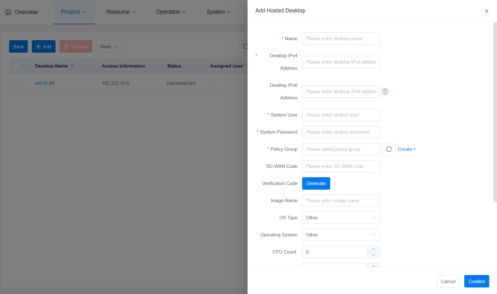 - Hosted desktops cannot automatically identify themselves via cloud platform APIs. Therefore, when adding, a "One-click Generate" verification code needs to be clicked.