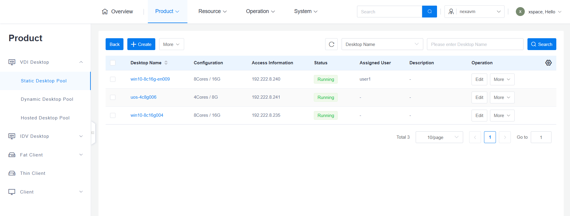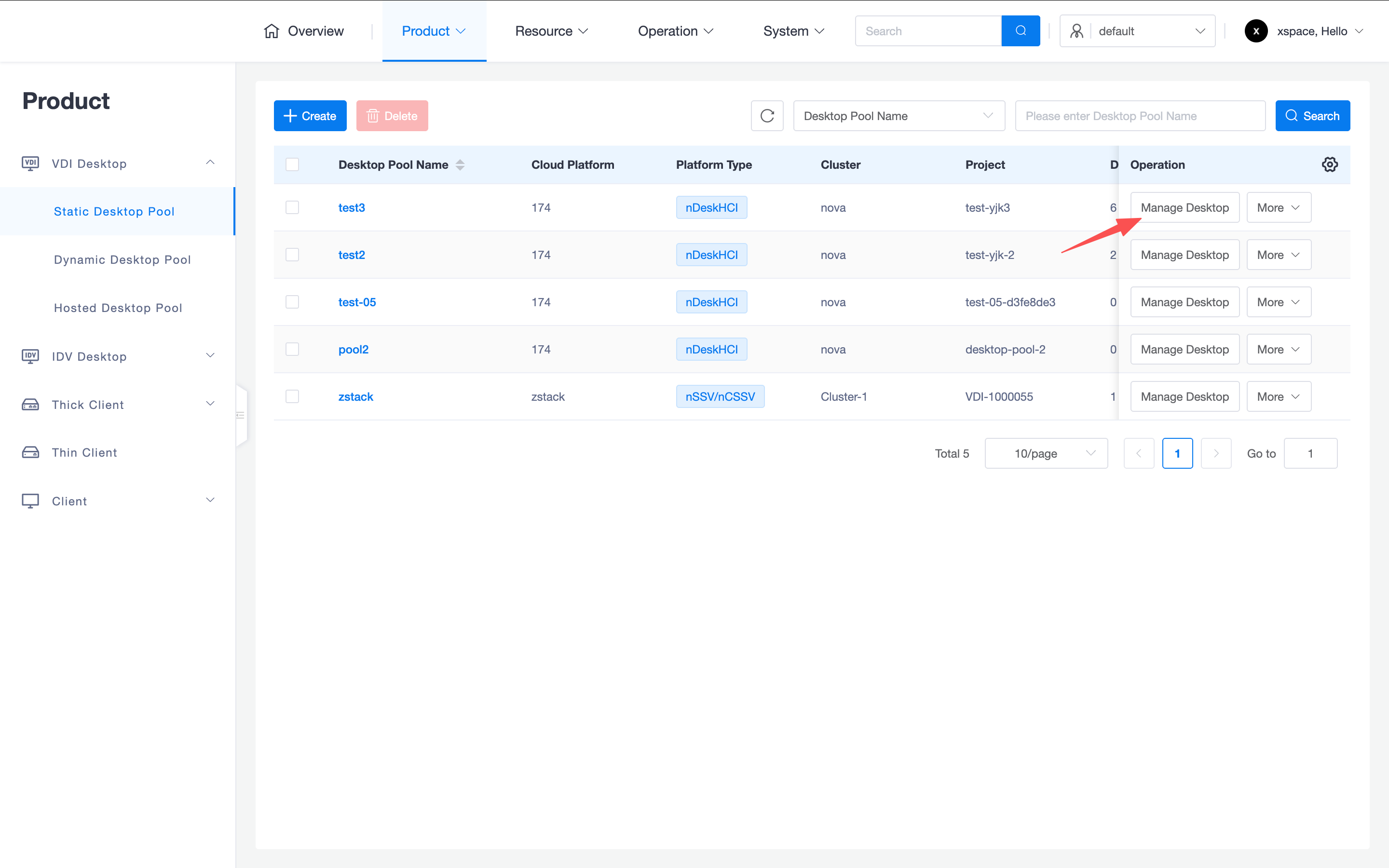 Click the "Manage Desktops" button on the right side of the dedicated desktop pool list to enter the desktop management interface for that desktop pool.