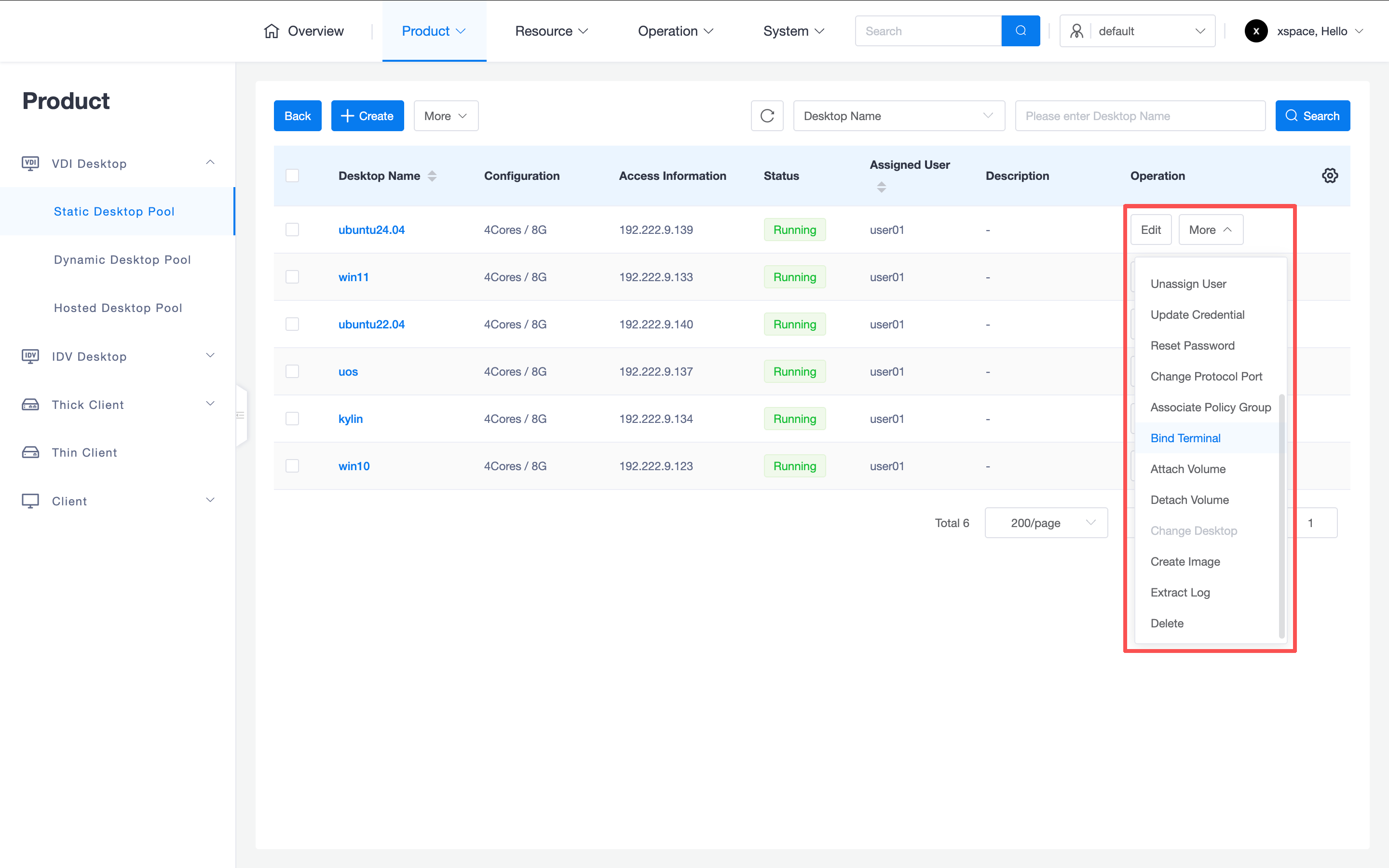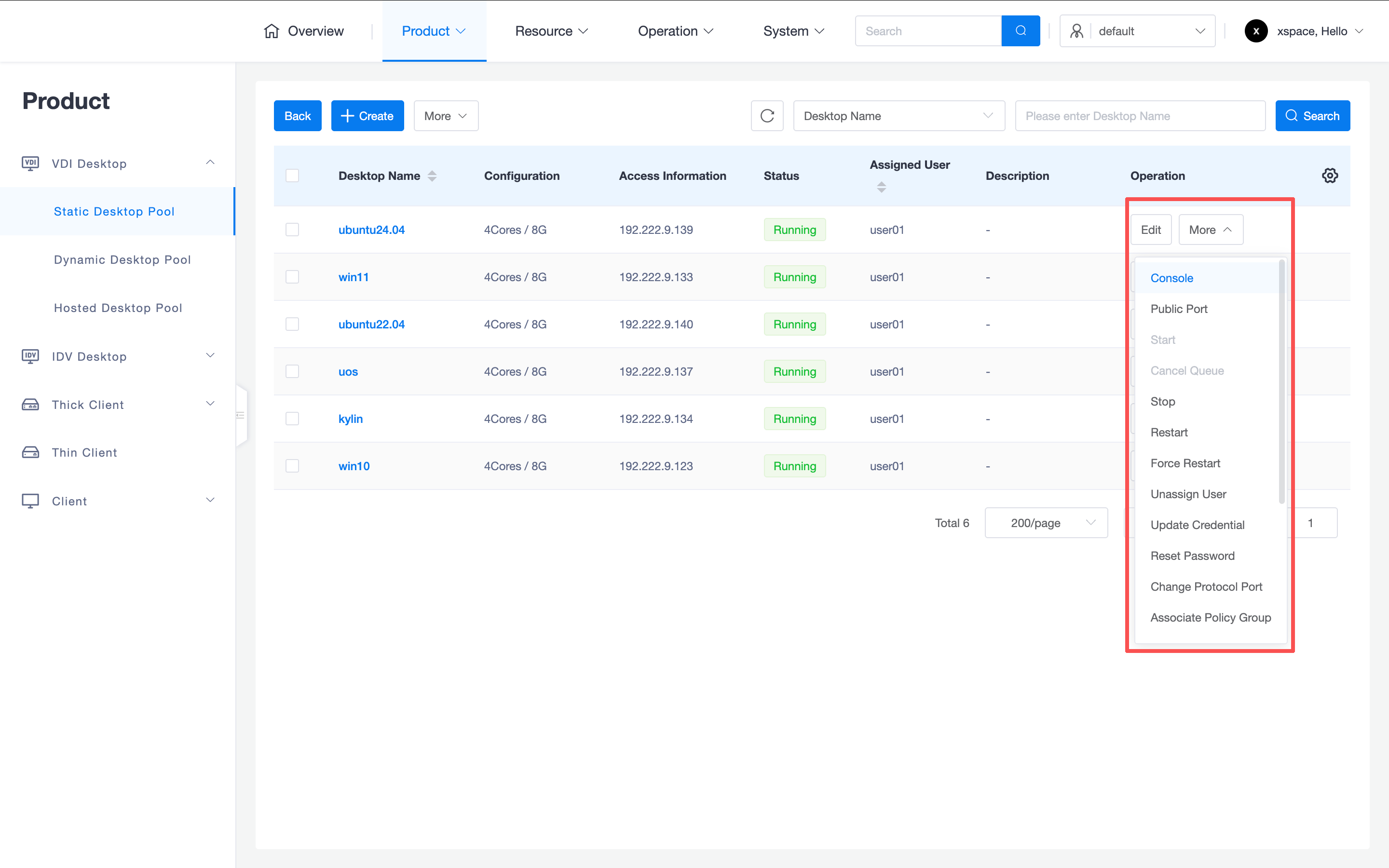 For existing cloud desktops, clicking the "More" button in the table allows for the following fine-grained maintenance operations (there are many operation buttons, scroll down to see more):