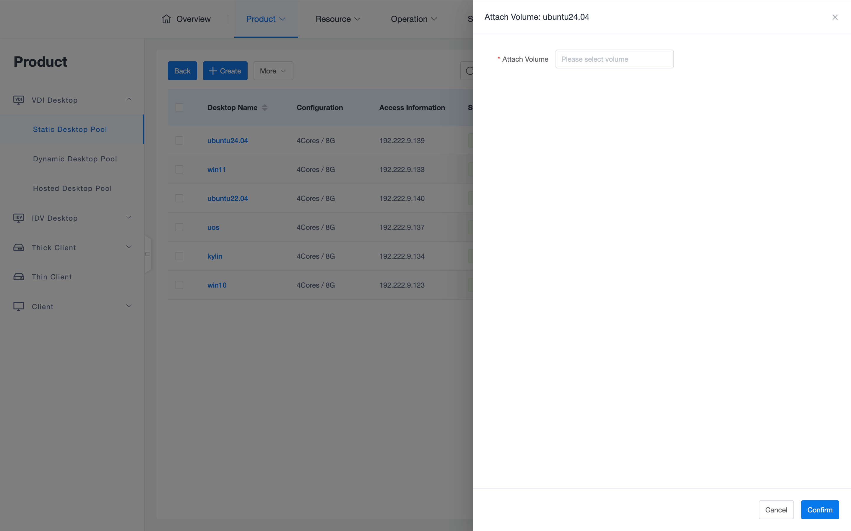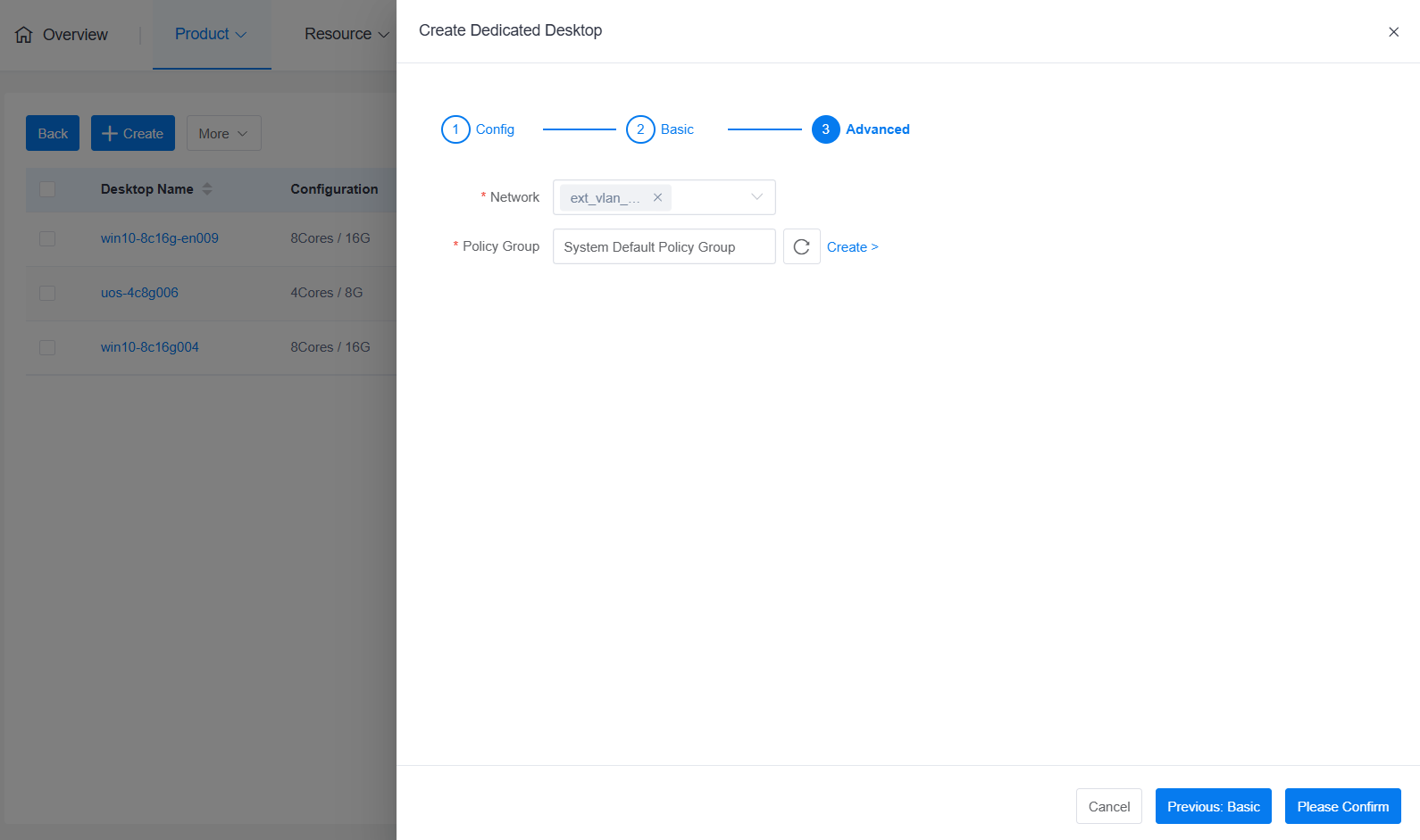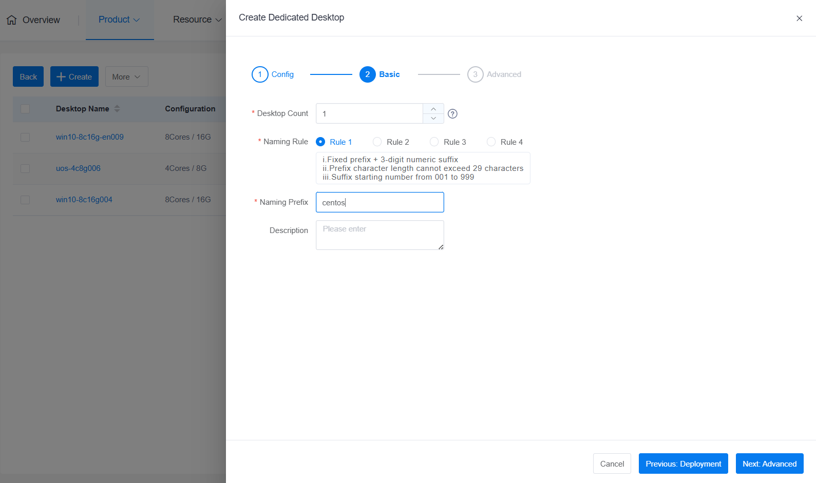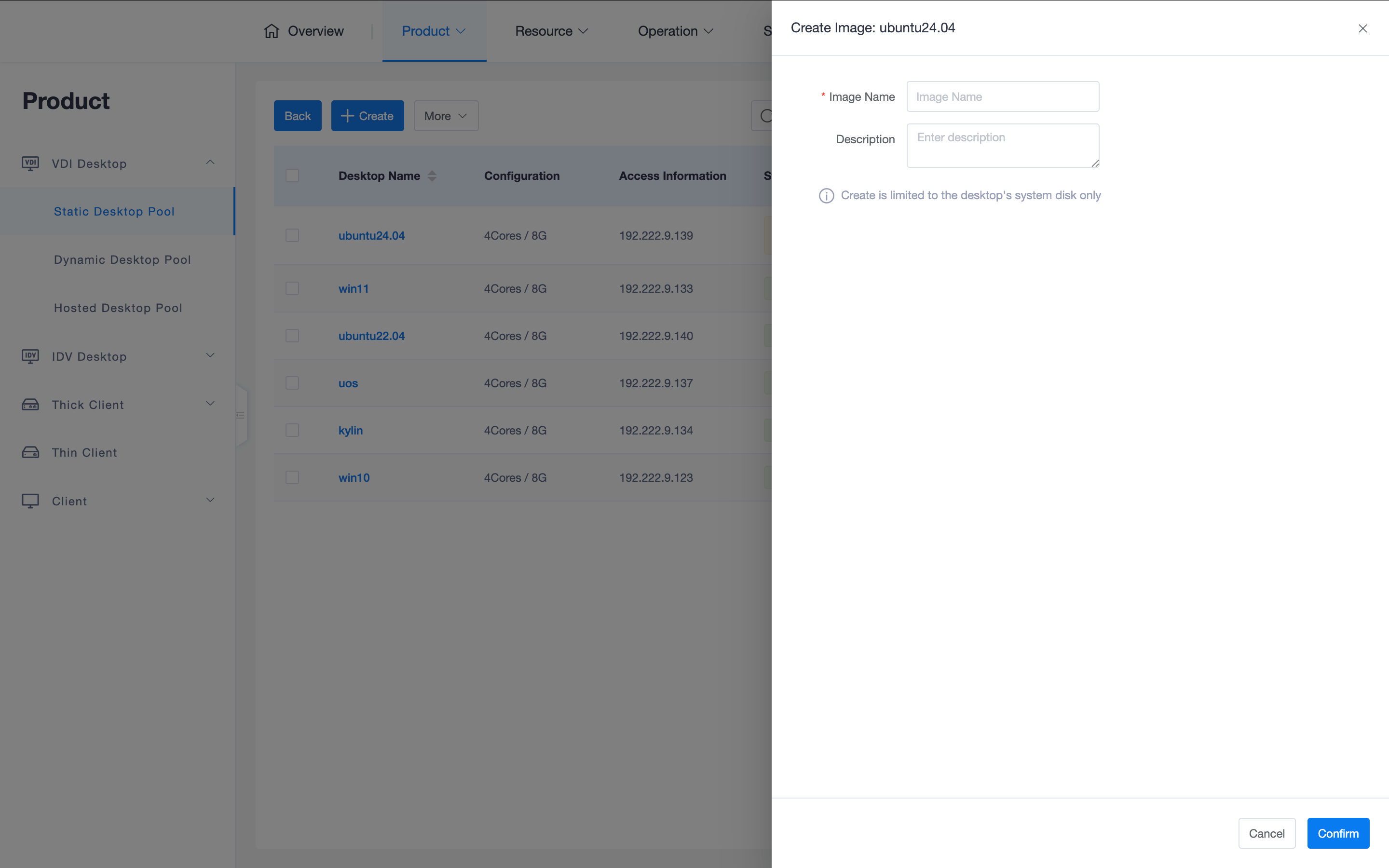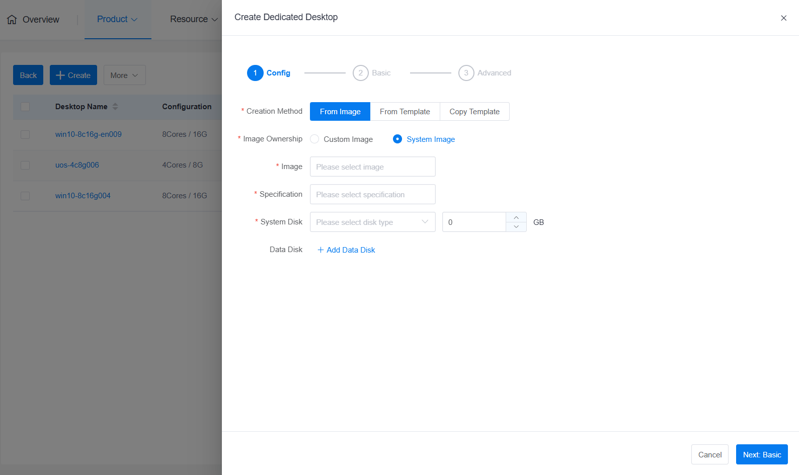 - Create from Template: Requires the system to have a preset template. Desktop configuration fully inherits from the template, and no parameters in the template can be modified during creation.