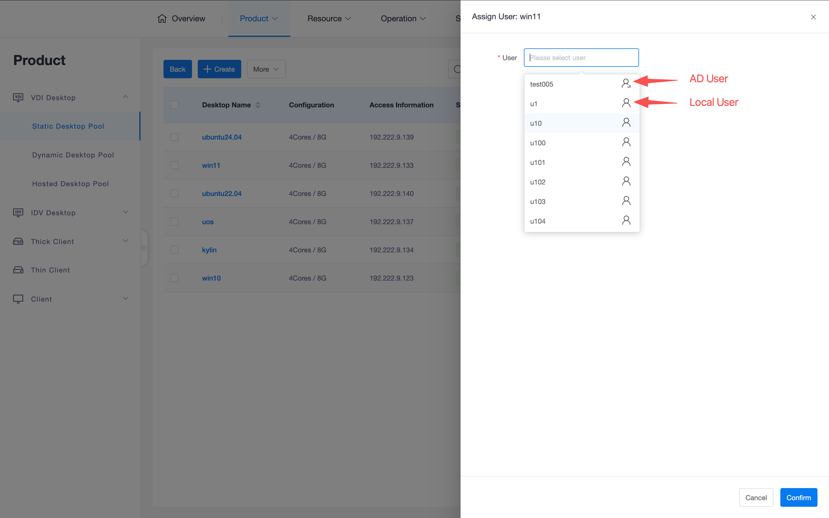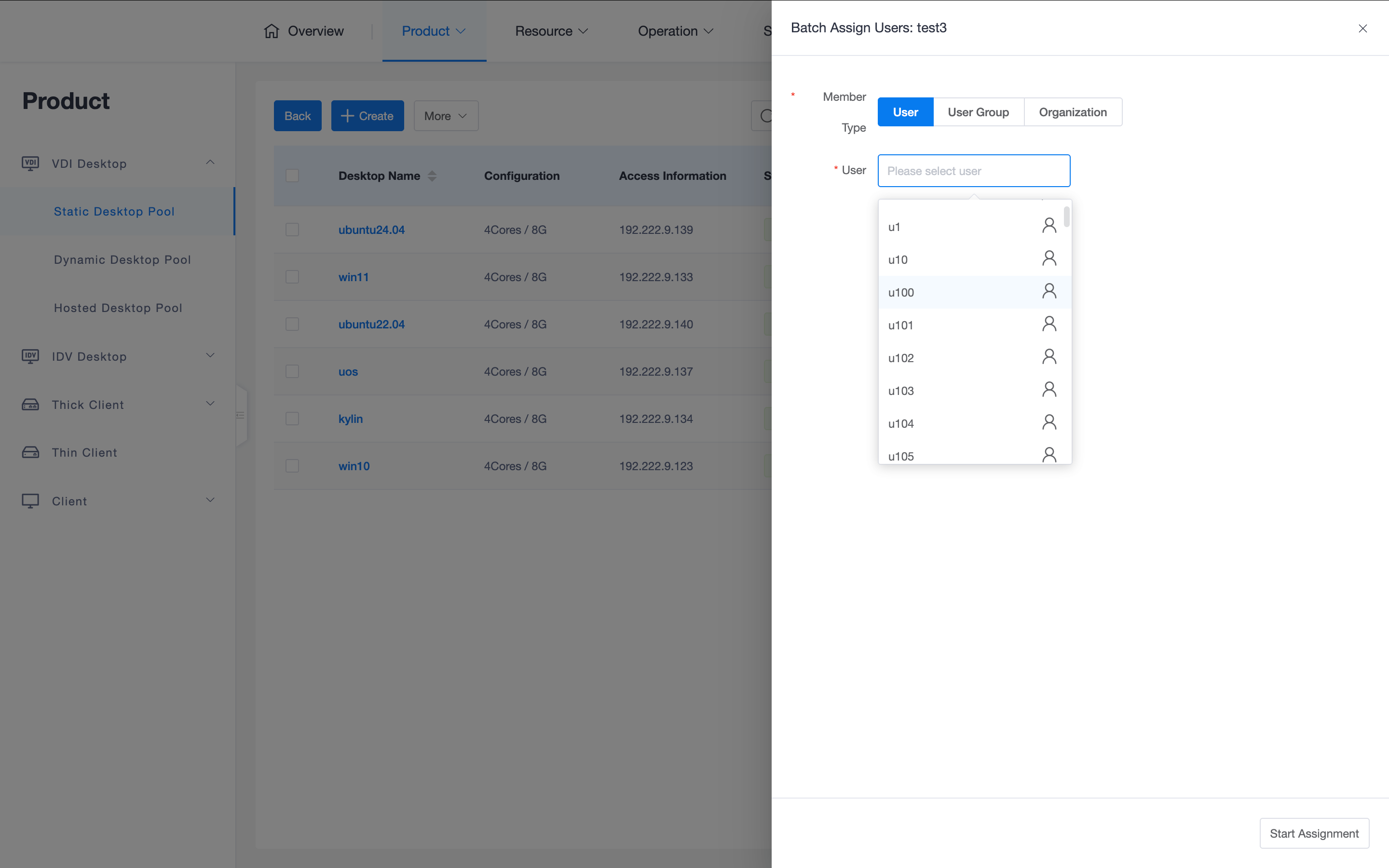 The system processes selected users, user groups, and organizations by taking their union, and automatically assigns a healthy desktop to each user who currently does not have a desktop in the pool (ensuring one desktop per person). If multiple desktops need to be assigned to a single user, use the "Assign User" operation for a single desktop in the desktop list.