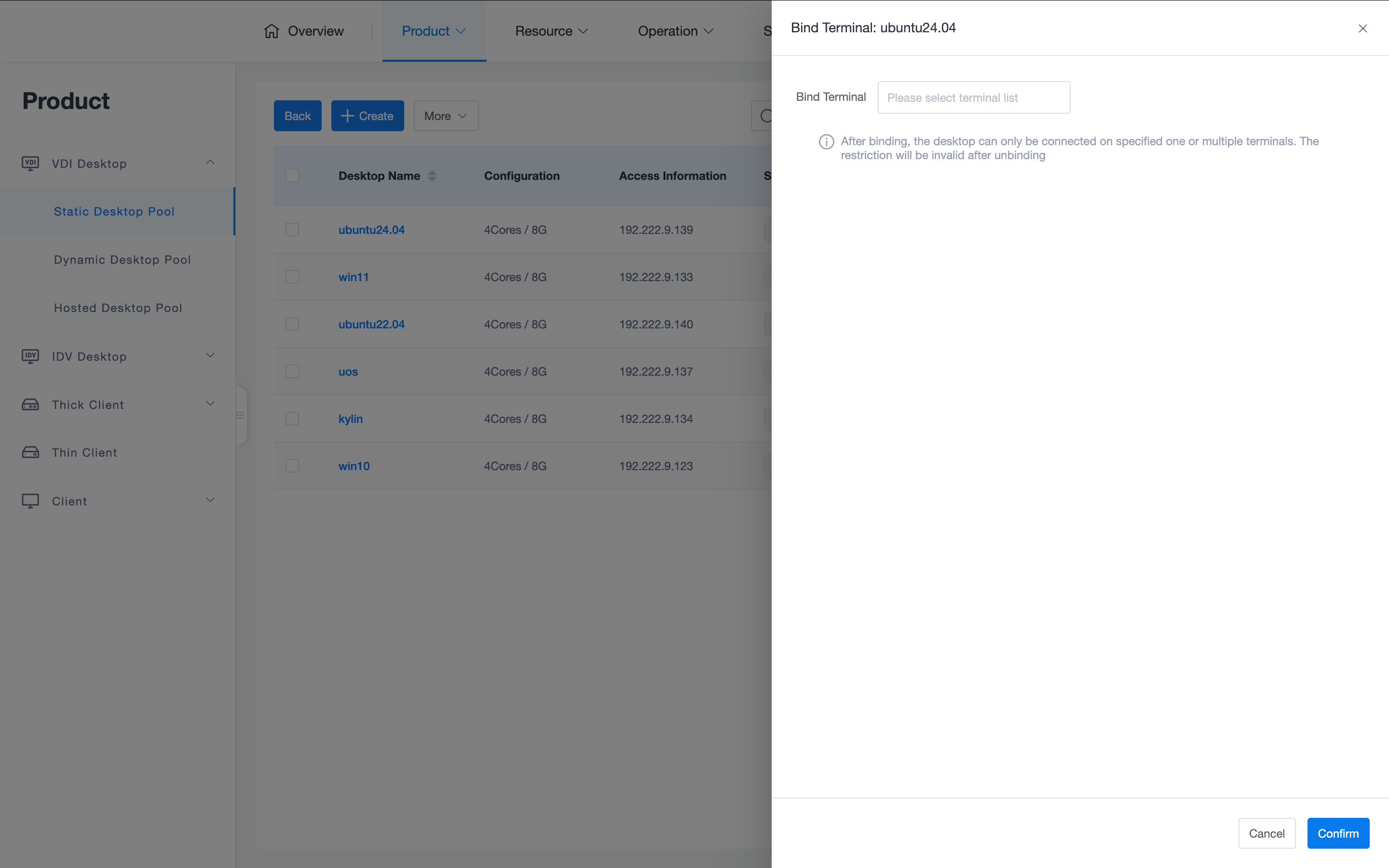 - Bind Terminal: Restricts connection to this desktop to only one or more specific terminal devices. If binding is enabled, even if the assigned user successfully authenticates on a non-specified terminal, the system will reject the connection request, achieving strong "person-machine-terminal" security control.