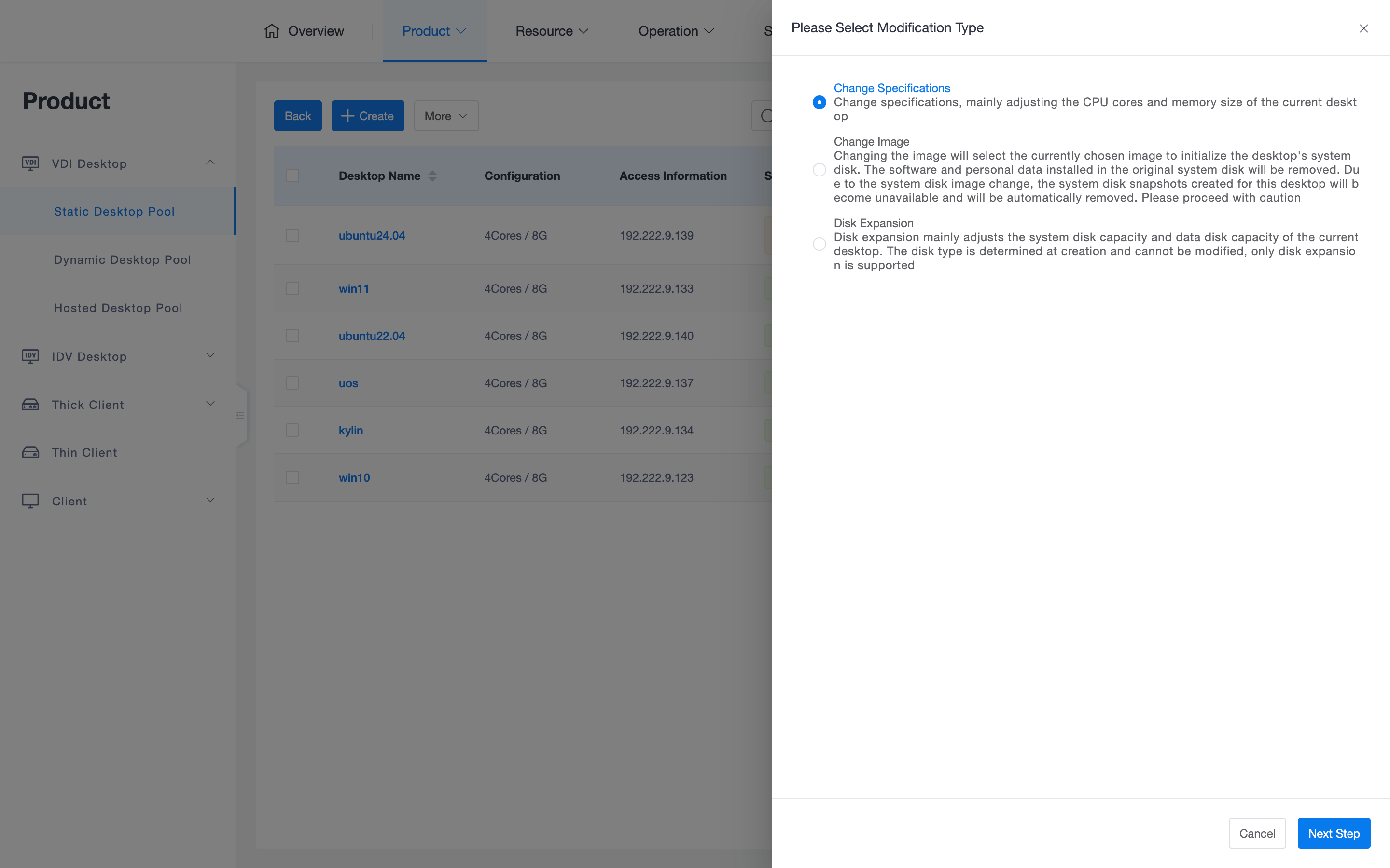 - Change Desktop: Only supported when powered off (currently only for OpenStack). Supports changing flavor, image, and disk expansion.
