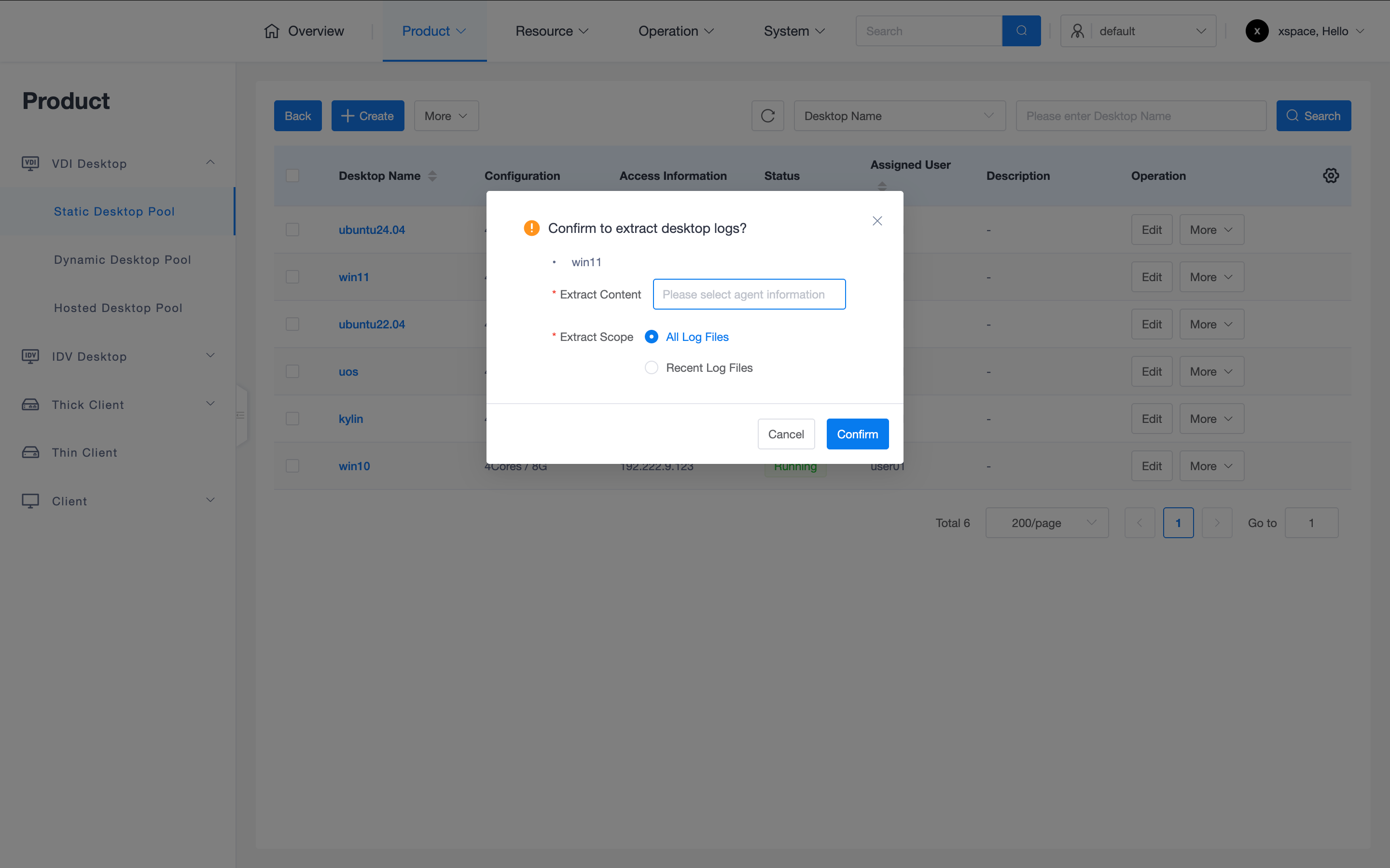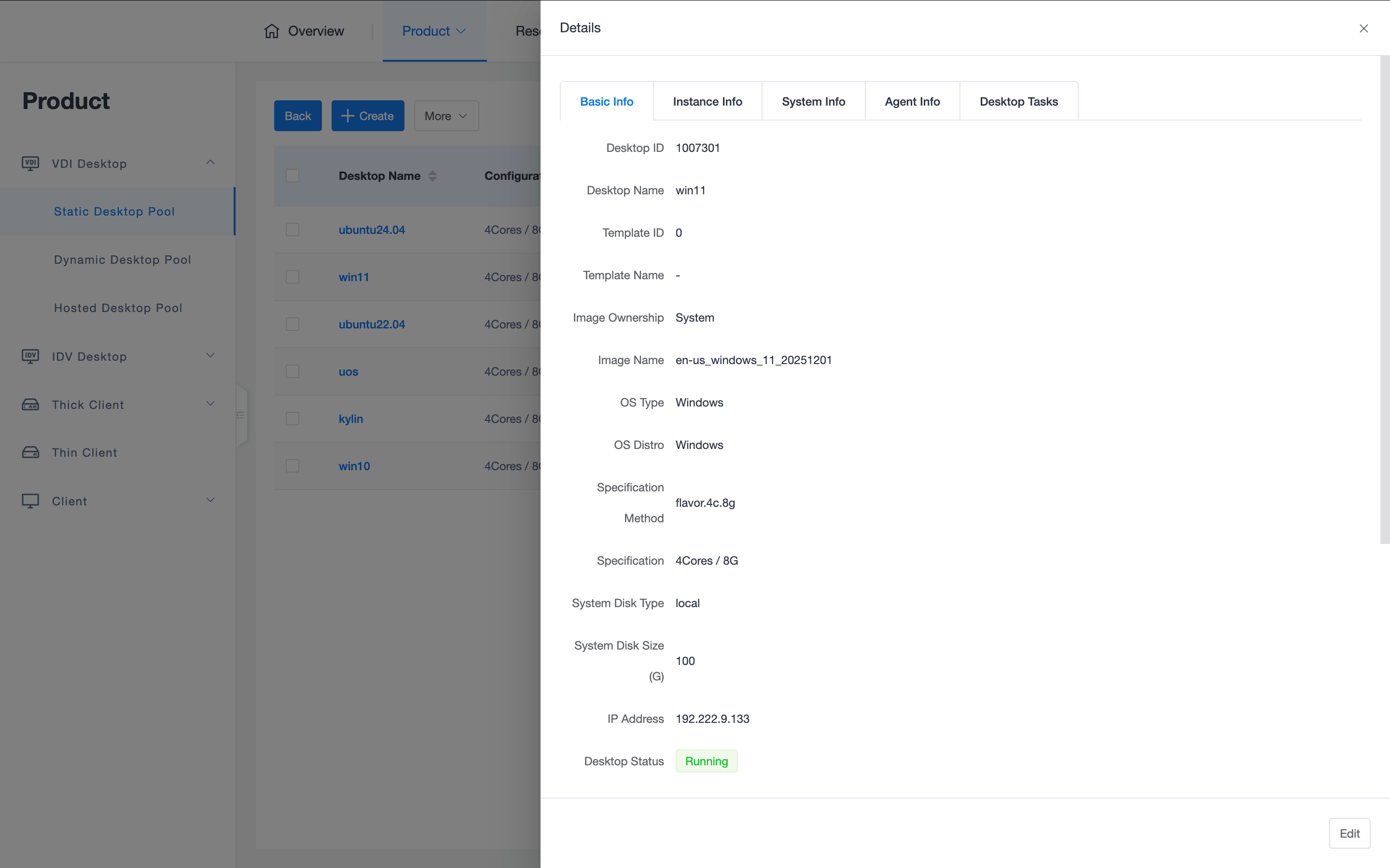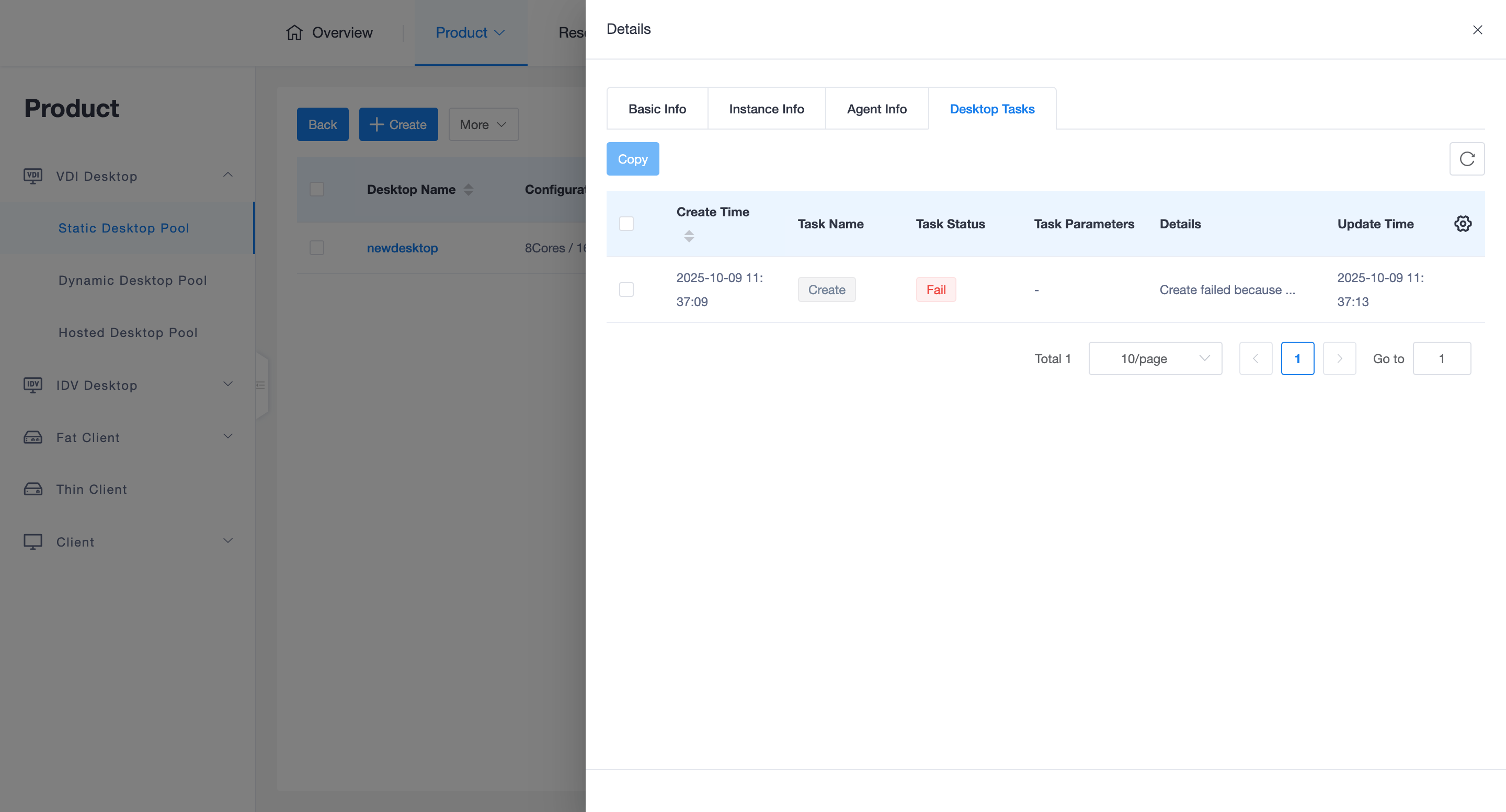 - Task Tracking: On the "Desktop Tasks" page, you can view the time, task name, result, and underlying details of all operations including creation, power on, and password reset.