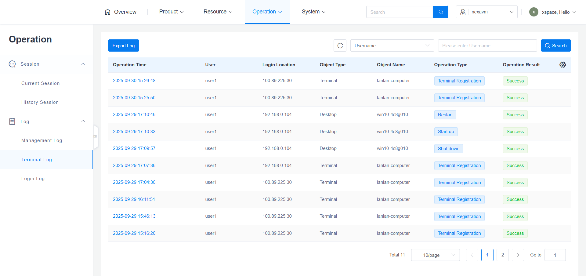 Through the "O&M -> Logs" section, tenant administrators can view logs of management, terminal, login, and other events occurring within their tenant, such as terminal logs: