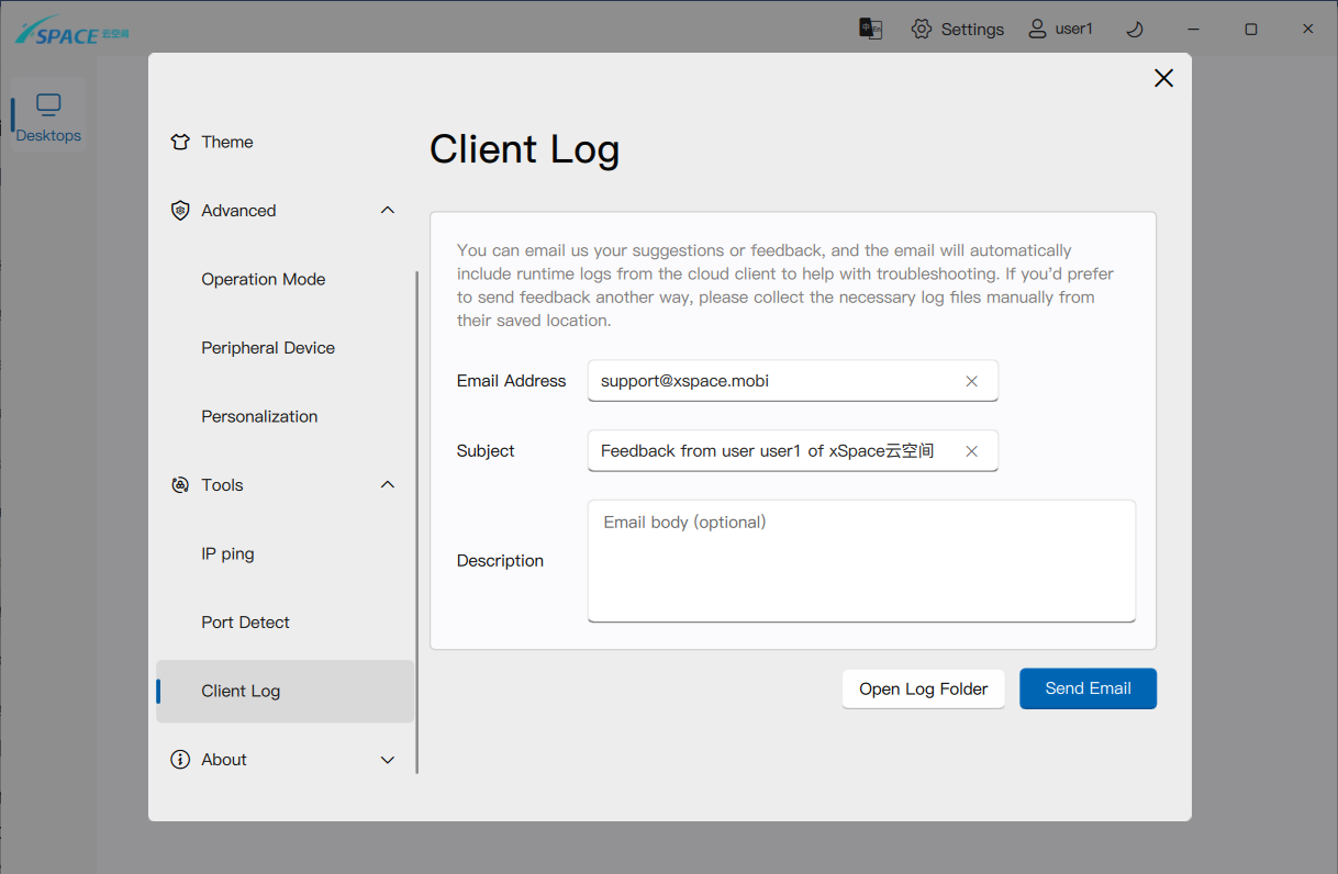 The above method extracts client local logs. If technical support needs to analyze internal cloud desktop operation logs, please contact the tenant administrator to perform the following operations: