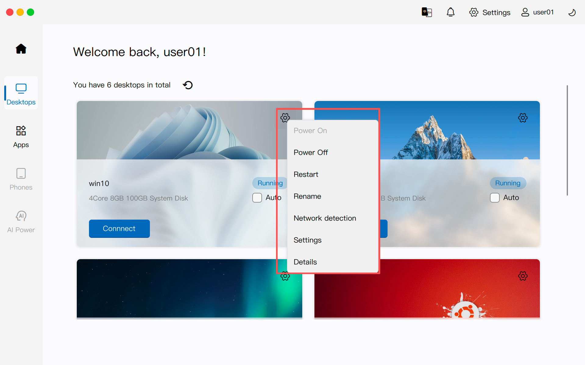 After logging in to the client, users can perform daily management and maintenance of their personal cloud desktops via the "gear" icon button in the upper right corner of the desktop card.