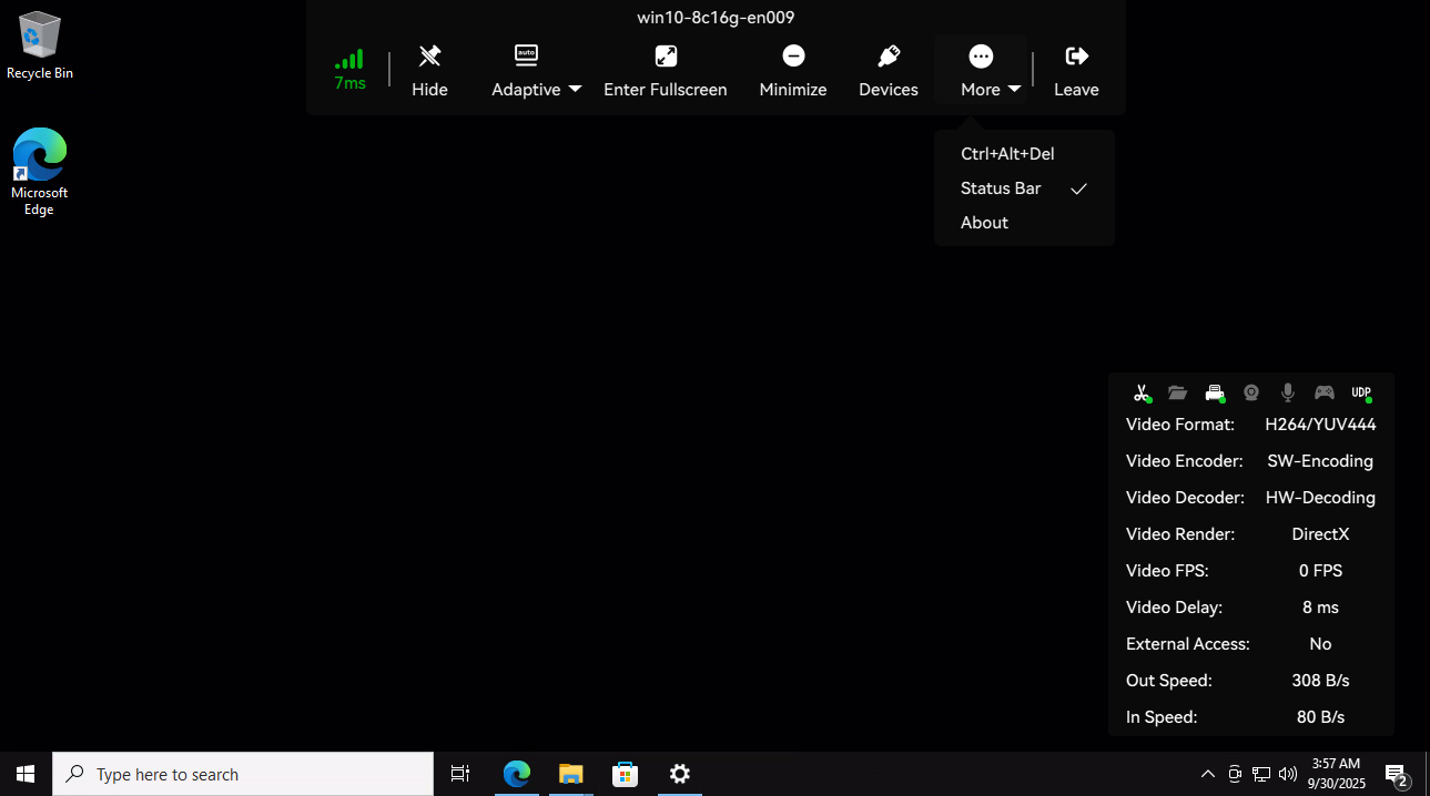 Click "More -> Show Status Bar" in the floating toolbar button to see more status information of the current remote desktop session in the lower right corner. When providing feedback on the experience to technical support personnel, please include a screenshot of this area.