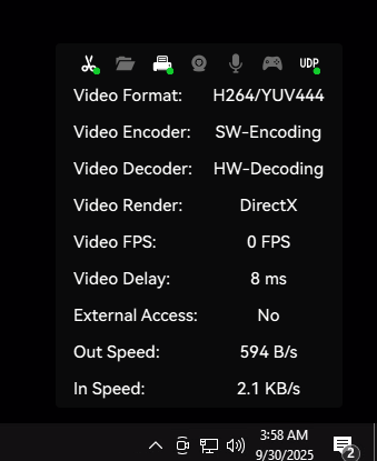 - Video Frame Rate: Indicates the number of video frames transmitted to the client per second. If extended screens are enabled, two values will be displayed here: the first is the main screen frame rate, and the second is the secondary screen frame rate.