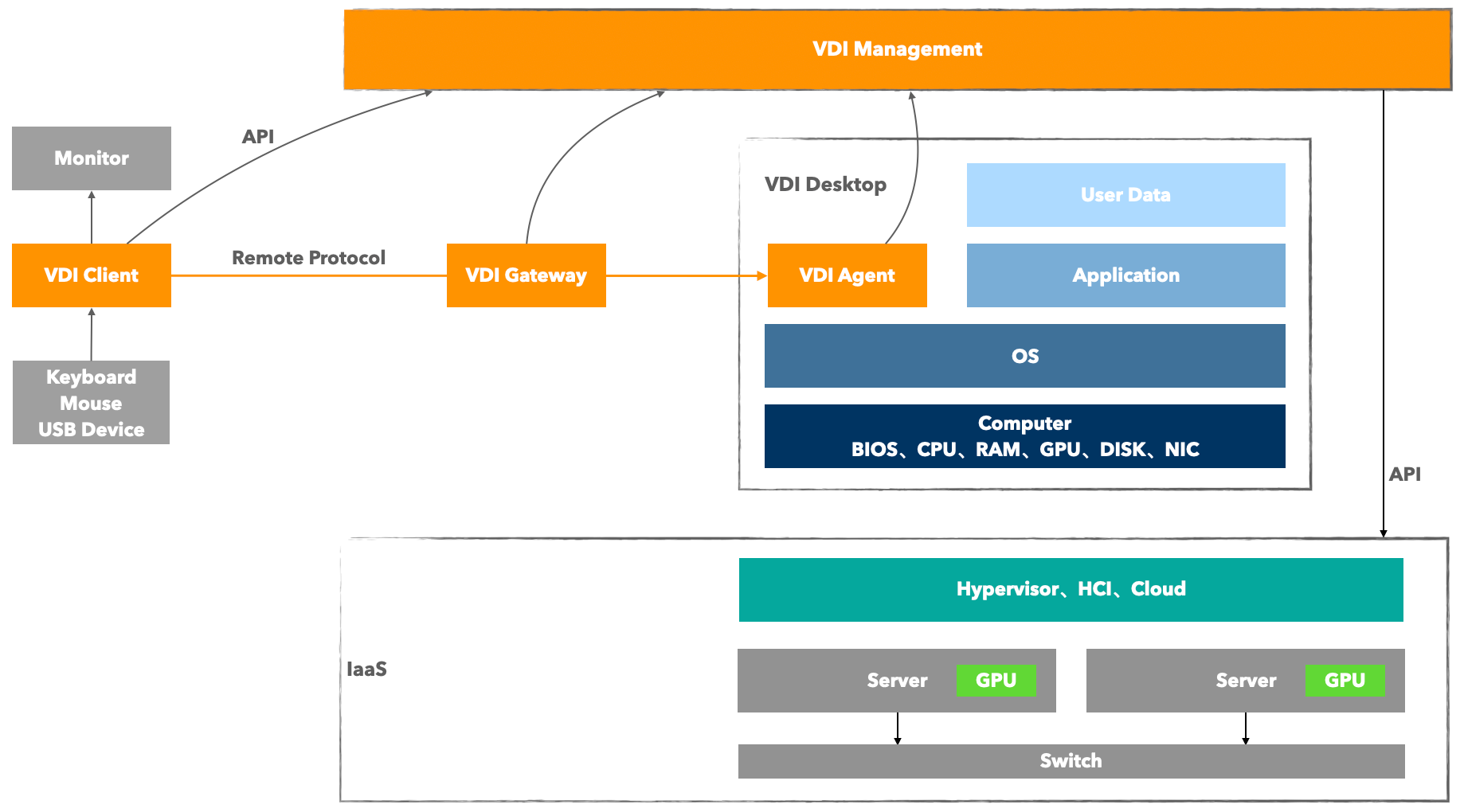 | 控制面 (Control Plane) | 客户端调用管理端 API,进行登录、获取桌面列表、下发开关机指令。 | 极轻量,仅包含 API 指令与状态信令。 |