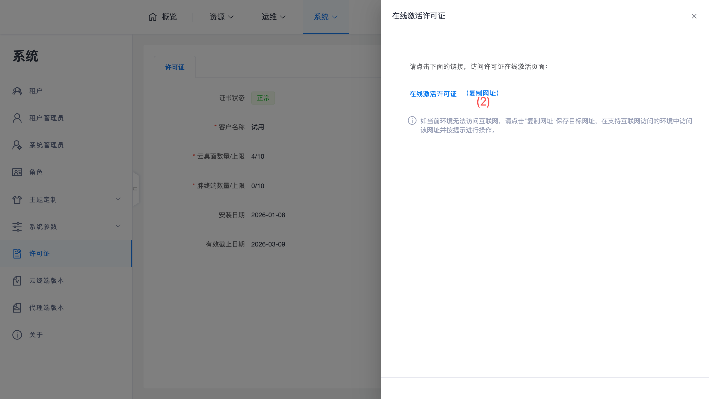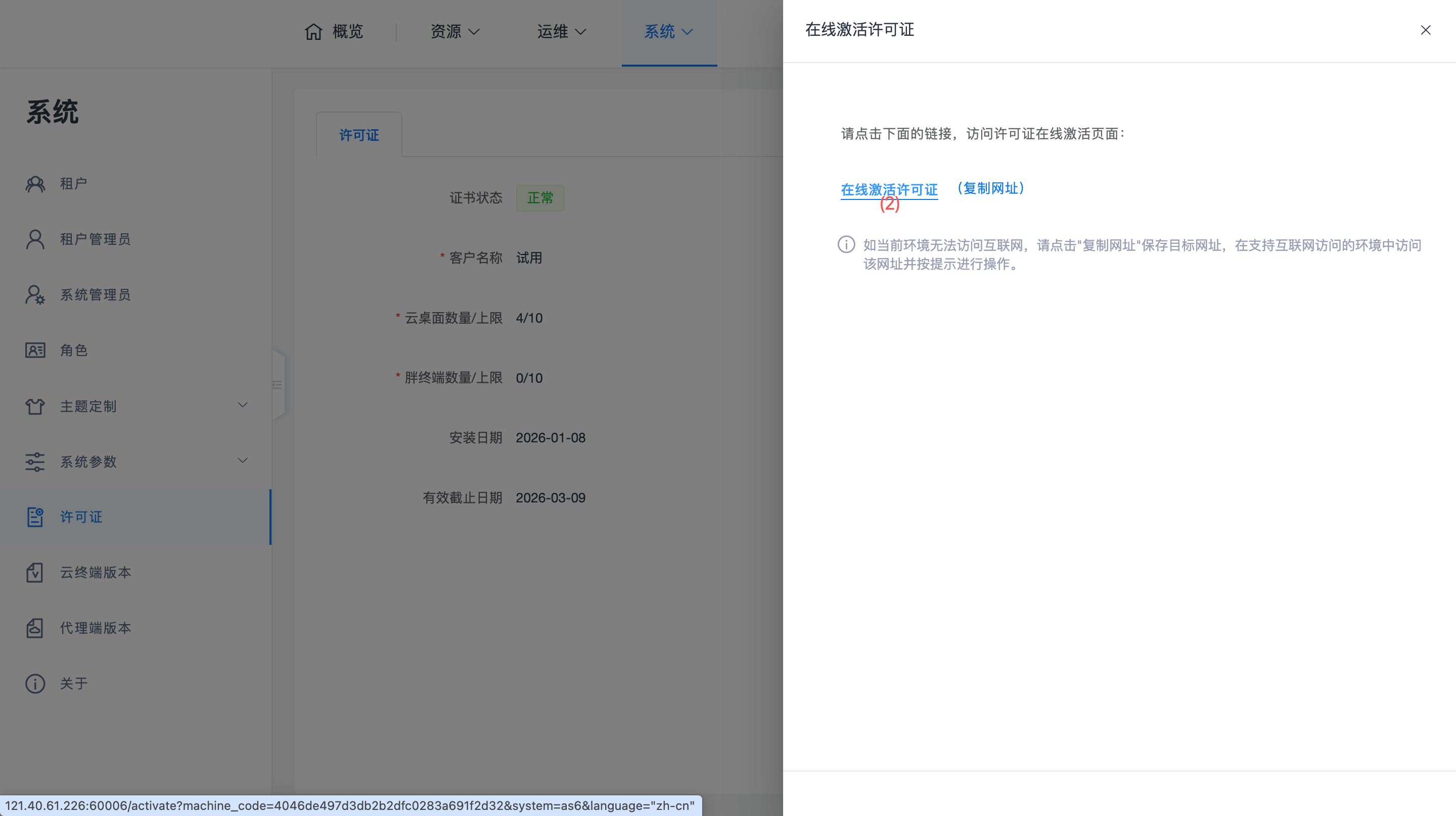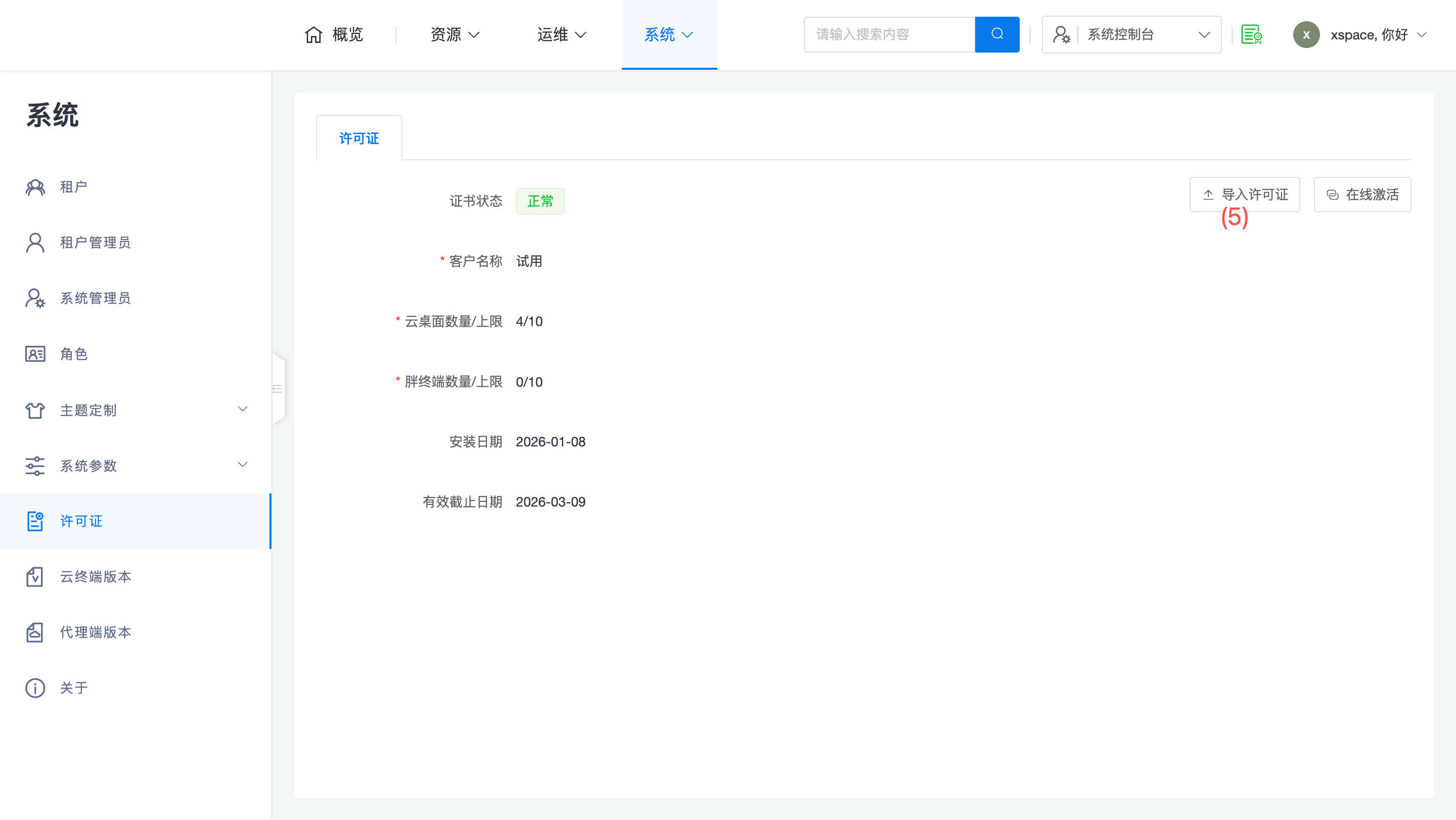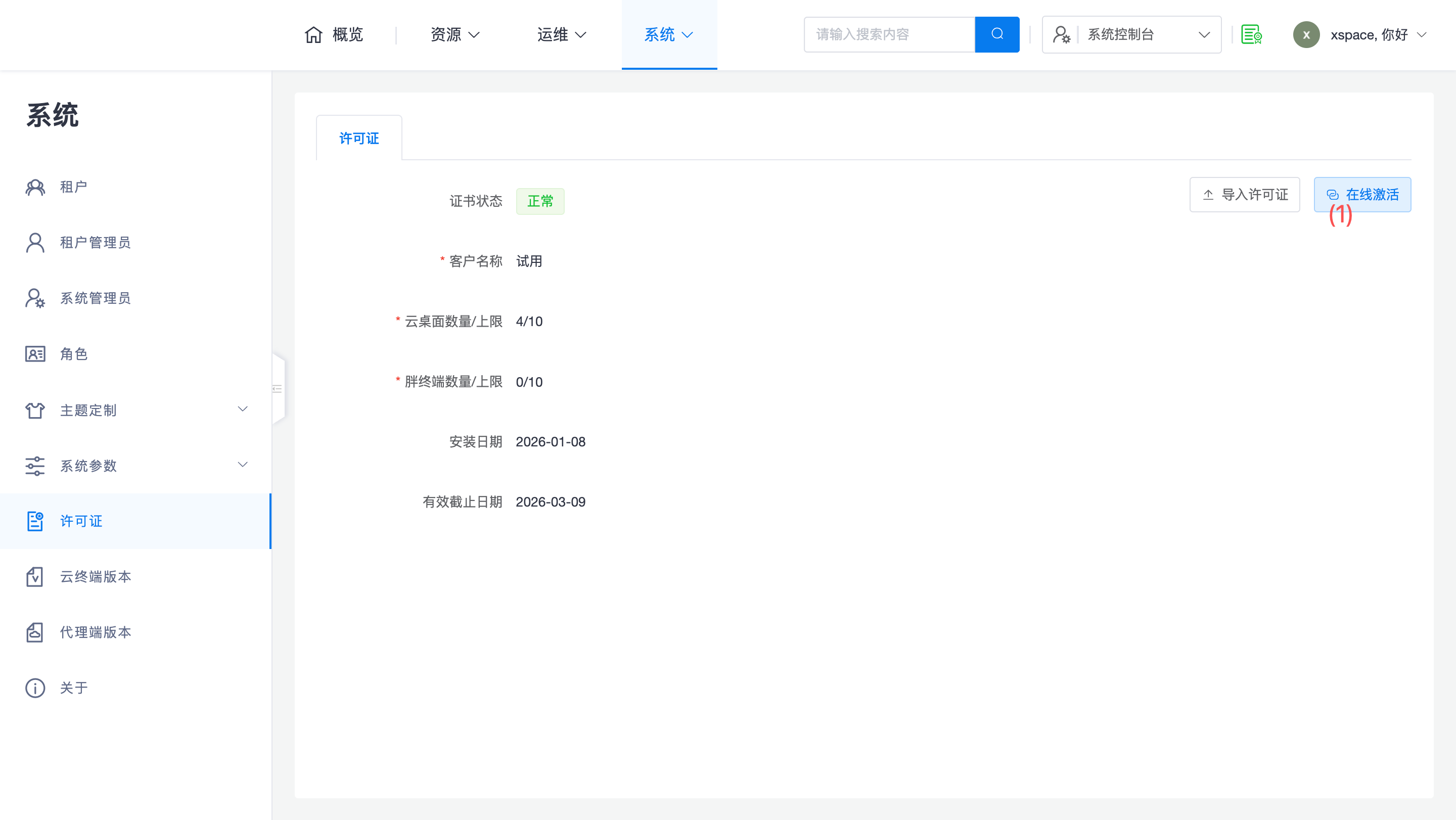 默认安装好的云空间管理端提供 2个月 的试用期,并支持管理最多 10台 云桌面。若需增加桌面实例数量或延长使用期限,请登录系统控制台,在“系统 -> 许可证”界面进行操作。