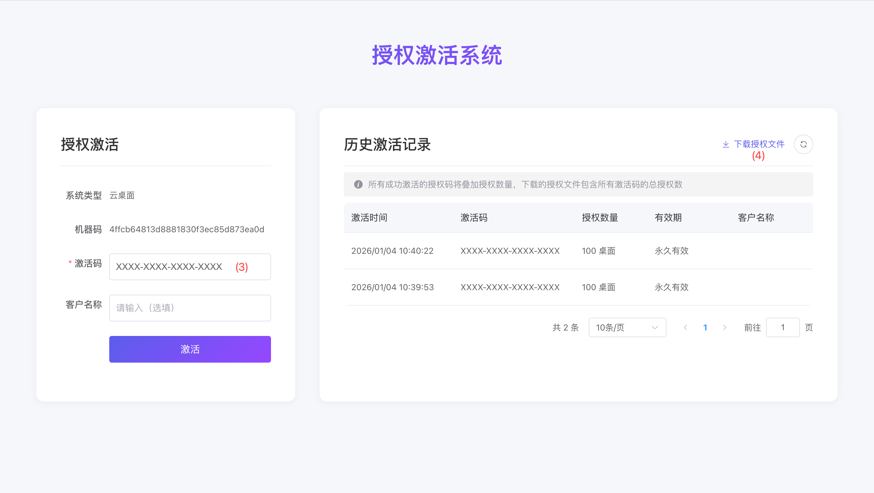 - 输入激活码:在授权网站的 “激活码” 输入框中填写商务提供的激活码,点击激活。